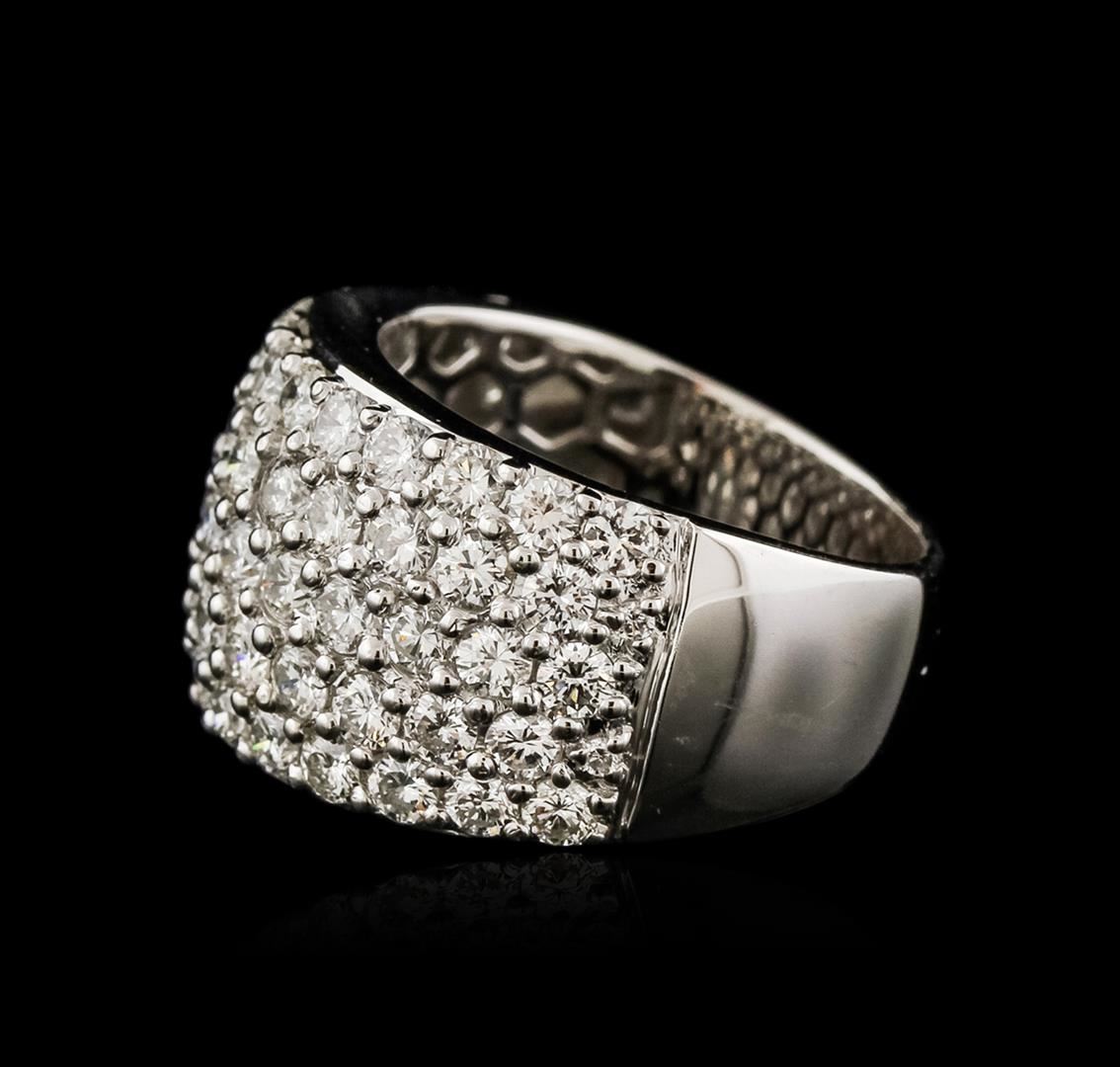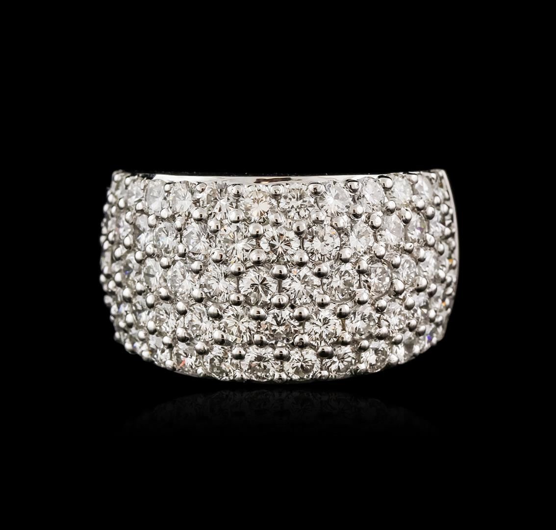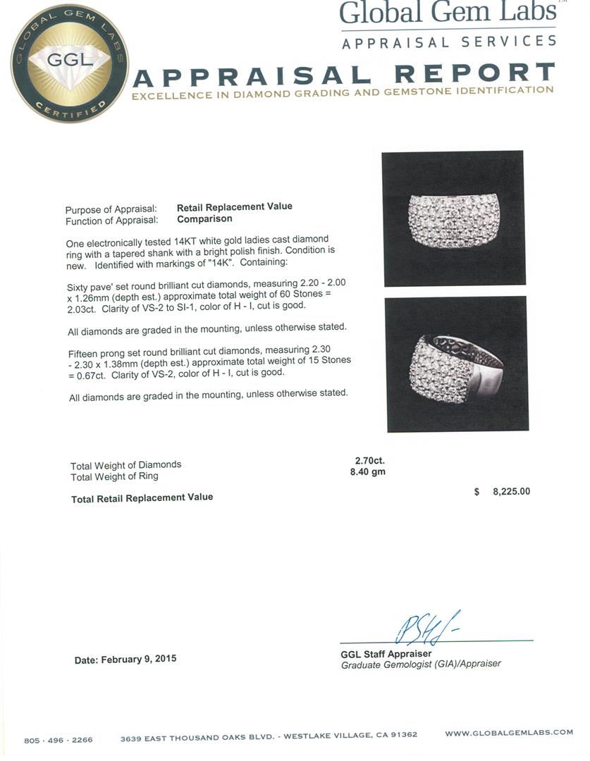 One electronically tested 14KT white gold ladies cast diamond ring with a tapered shank with a bright polish finish. Identified with markings of "14K". Condition is new. Containing: Sixty pave' set round brilliant cut diamonds, measuring 2.20 - 2.00 x 1.26mm (depth est.) approximate total weight of 60 Stones = 2.03ct. Clarity: VS-2 to SI-1. Color: H - I, Cut is Good. All diamonds are graded in the mounting, unless otherwise stated. Fifteen prong set round brilliant cut diamonds, measuring 2.30 - 2.30 x 1.38mm (depth est.) approximate total weight of 15 Stones = 0.67ct. Clarity: VS-2. Color: H - I, Cut is Good. All diamonds are graded in the mounting, unless otherwise stated. Total Weight of Diamonds 2.70ct. Total Weight of Ring 8.40 grams. GGL Appraised at $8,225.00.