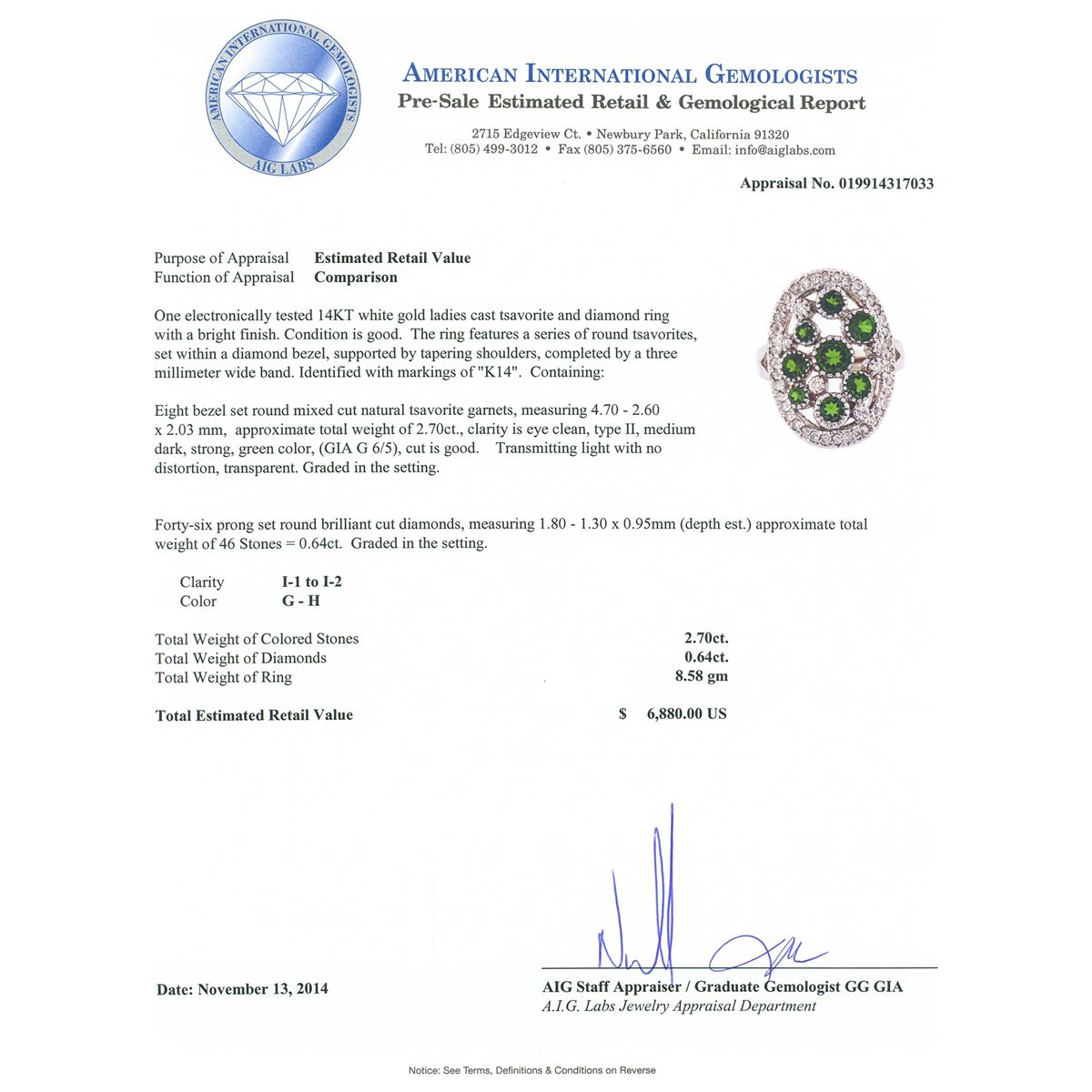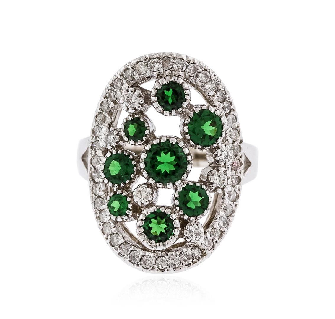 One electronically tested 14KT white gold ladies cast tsavorite and diamond ring with a bright finish. The ring features a series of round tsavorites, set within a diamond bezel, supported by tapering shoulders, completed by a three millimeter wide band. Identified with markings of "K14". Condition is good. Containing: Eight bezel set round mixed cut natural tsavorite garnets, measuring 4.70 - 2.60 x 2.03 mm, approximate total weight of 2.70ct., clarity is eye clean, type II, medium dark, strong, green color, (GIA G 6/5), cut is good. Transmitting light with no distortion, transparent. Graded in the setting. Forty-Six prong set round brilliant cut diamonds, measuring 1.80 - 1.30 x 0.95mm (depth est.) approximate total weight of 46 Stones = 0.64ct. Graded in the setting. Clarity I-1 to I-2. Color G -- H. Total Weight of Colored Stones 2.70ct. Total Weight of Diamonds 0.64ct. Total Weight of Ring 8.58 grams. AIG Appraised at $6,880.00.