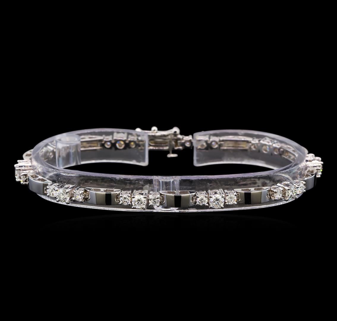 One electronically tested 14KT white gold ladies cast diamond bracelet with a hidden box clasp with safety closer with a bright polish finish. Measurements: 7 " in length Identified with markings of "14K". Condition is new. Containing: Ten prong set round brilliant cut diamonds, measuring 3.50 - 3.50 x 2.10mm (depth est.) approximate total weight of 10 Stones = 1.57ct. Clarity: SI-1 to I-1. Color: I - J, Cut is Good. Twenty prong set round brilliant cut diamonds, measuring 2.50 - 2.50 x 1.50mm (depth est.) approximate total weight of 20 Stones = 1.14ct. Clarity: SI-1 to I-1. Color: I - J, Cut is Good. All diamonds are graded in the mounting, unless otherwise stated. Total Weight of Diamonds 2.71ct. Total Weight of Bracelet 15.20 grams. GGL Appraised at $8,280.00.