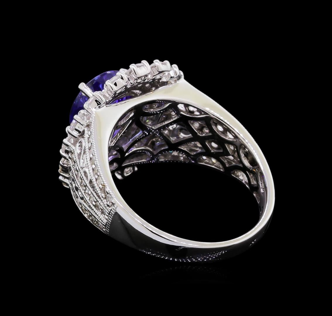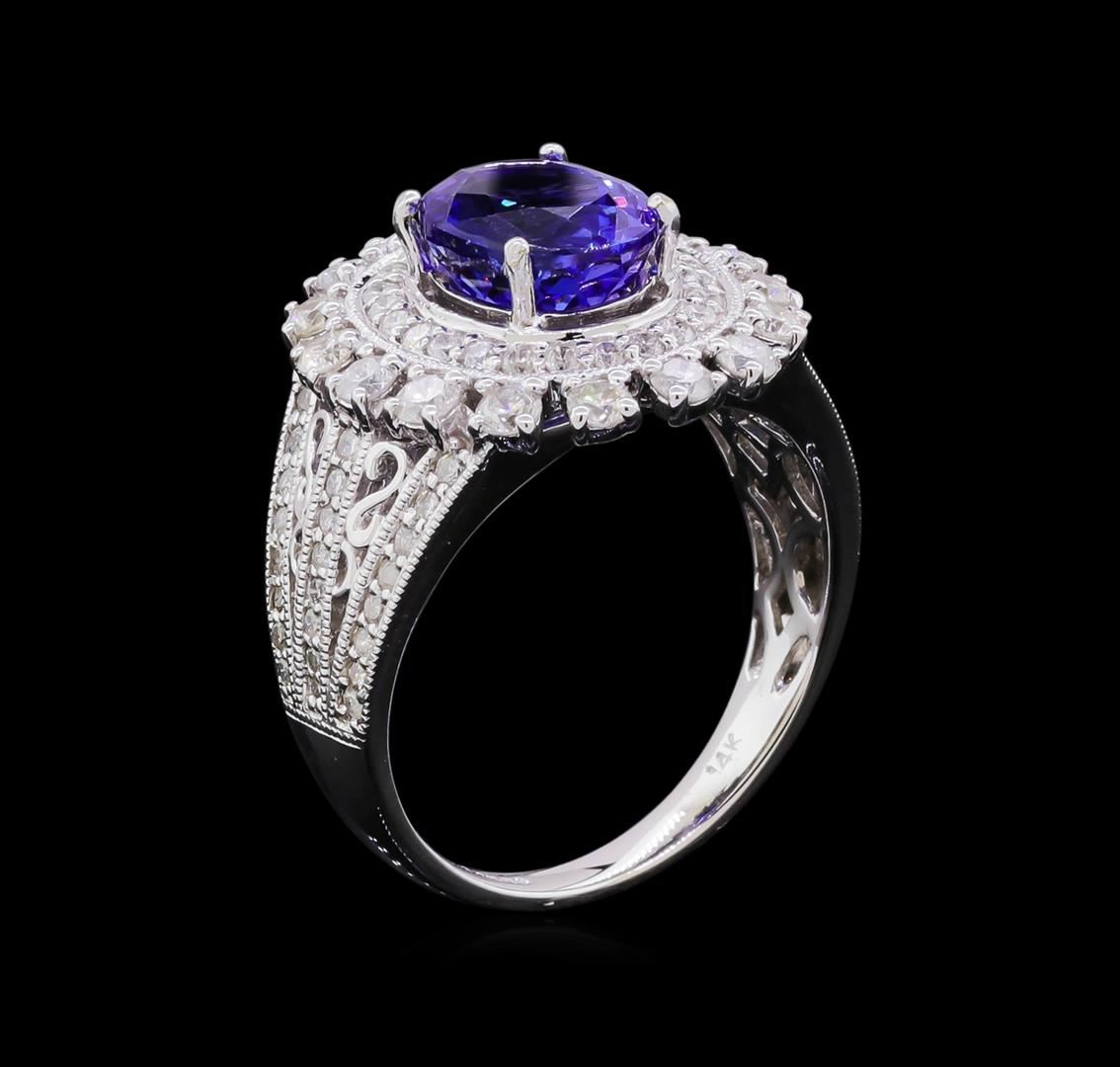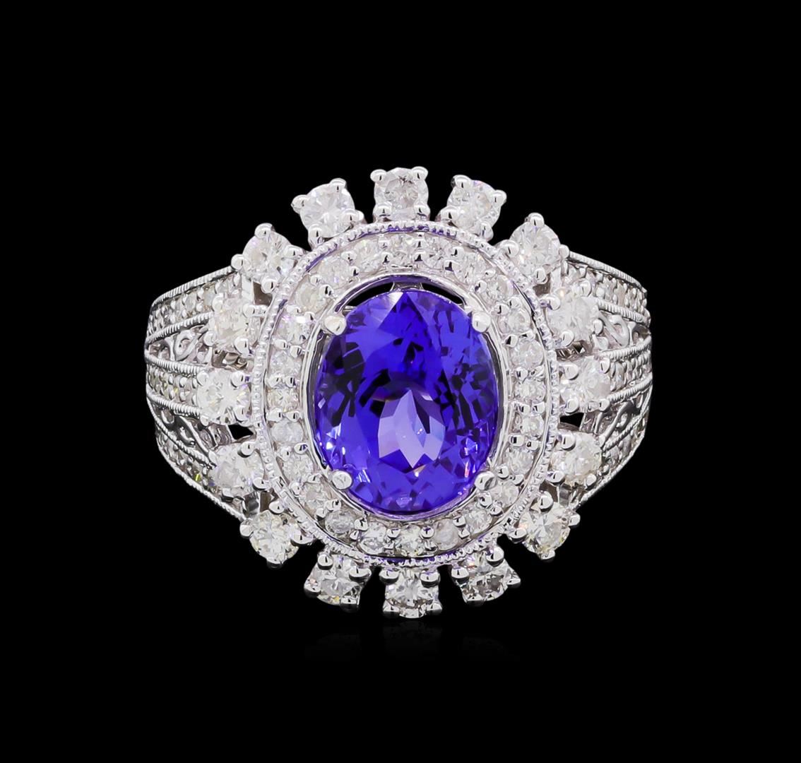 One polished, stamped, and electronically tested solid 14KT White Gold ring mounted with: 1 genuine tanzanite center stone weighing 2.71 carats and 88 genuine round diamonds weighing 1.20 carats. This item weighs 6.3 grams, condition is new, excellent workmanship. AIGL Appraised.