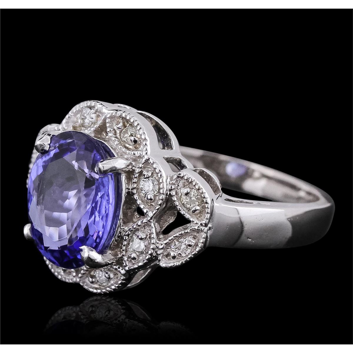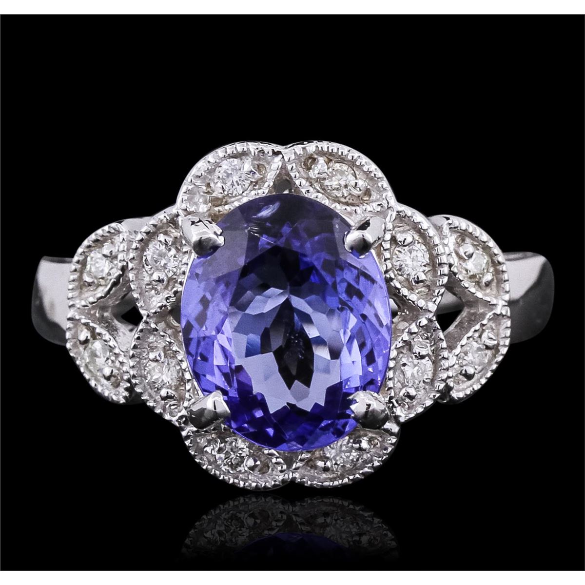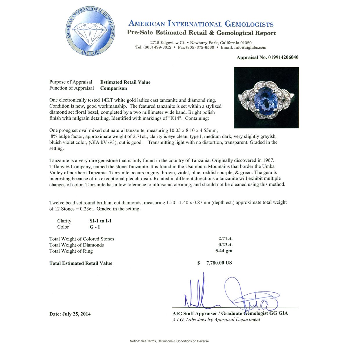 One electronically tested 14KT white gold ladies cast tanzanite and diamond ring. The featured tanzanite is set within a stylized diamond set floral bezel, completed by a two millimeter wide band. Bright polish finish with milgrain detailing. Identified with markings of "K14". Condition is new, good workmanship. Containing: One prong set oval mixed cut natural tanzanite, measuring 10.05 x 8.10 x 4.55mm, 8%. bulge factor, approximate weight of 2.71ct., clarity is eye clean, type I, medium dark, very slightly grayish, bluish violet color, (GIA bV 6/3), cut is good. Transmitting light with no distortion, transparent. Graded in the setting. Tanzanite is a very rare gemstone that is only found in the country of Tanzania. Originally discovered in 1967. Tiffany & Company, named the stone Tanzanite. It is found in the Usumburu Mountains that border the Umba Valley of northern Tanzania. Tanzanite occurs in gray, brown, violet, blue, reddish-purple, & green. The gem is interesting because of its exceptional pleochroism. Rotated in different directions a tanzanite will exhibit multiple changes of color. Tanzanite has a low tolerance to ultrasonic cleaning, and should not be cleaned using this method. Twelve bead set round brilliant cut diamonds, measuring 1.50 - 1.40 x 0.87mm (depth est.) approximate total weight of 12 Stones = 0.23ct. Graded in the setting. Clarity: SI-1 to I-1. Color: G - I. Total Weight of Colored Stones 2.71ct. Total Weight of Diamonds 0.23ct. Total Weight of Ring 5.44 grams. AIG Appraised at $7,780.00.