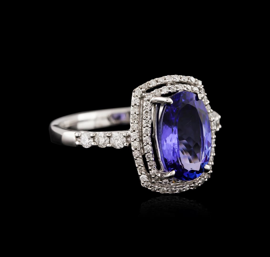 One electronically tested 14KT white gold ladies cast tanzanite and diamond ring with a bright polish finish. Identified with markings of "14K". Condition is new. Containing: One prong set rectangular cushion modified brilliant cut natural tanzanite, measuring 10.45 x 6.89 x 4.78mm, approximate weight of 2.71ct., clarity is eye clean, type I, medium light, very slightly grayish, violet color, (GIA V 4/3), cut is good. Seventy-Four prong set round brilliant cut diamonds, measuring 1.00 - 1.00 x 0.60mm (depth est.) approximate total weight of 74 Stones = 0.27ct. Clarity: I-1 to I-2. Color: I - J. Colored gemstones are presumed to have been subjected to commonly used enhancement processes. All diamonds and colored gemstones are graded in the mounting, unless otherwise stated. Total Weight of Colored Stones 2.71ct. Total Weight of Diamonds 0.27ct. Total Weight of Ring 3.30 grams. GGL Appraised at $3,085.00.