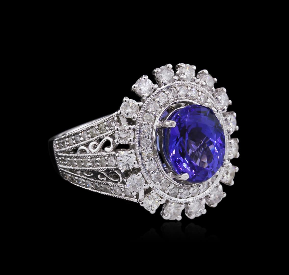 One polished, stamped, and electronically tested solid 14KT White Gold ring mounted with: 1 genuine tanzanite center stone weighing 2.71 carats and 88 genuine round diamonds weighing 1.20 carats. This item weighs 6.3 grams, condition is new, excellent workmanship. AIGL Appraised at $6,975.00.