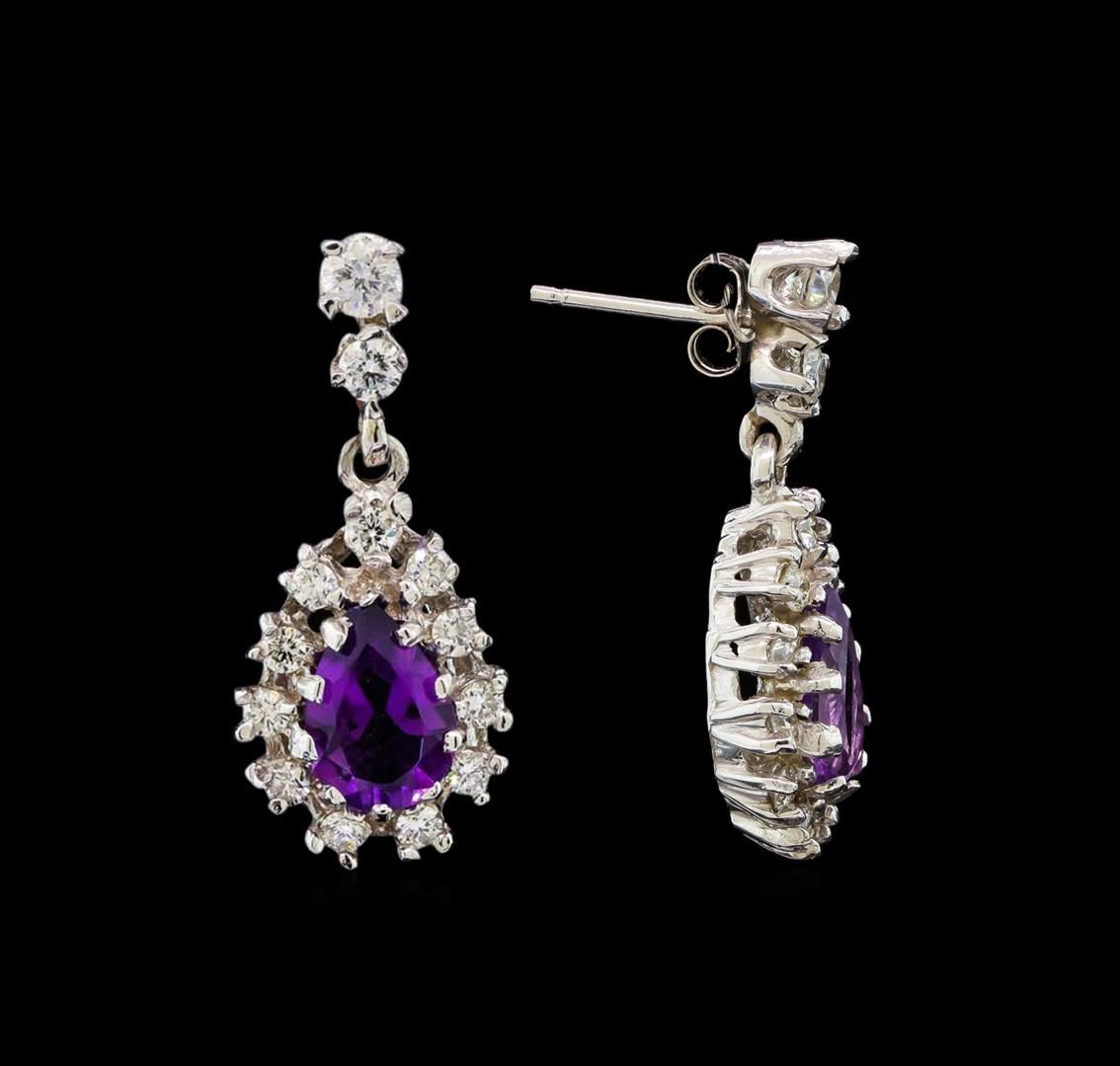 One pair electronically tested 14KT white gold ladies cast amethyst and diamond earrings with friction posts with a bright polish finish. Condition is new. Containing: Two prong set pear modified brilliant cut natural amethysts, measuring 8.50 x 6.80 x 4.42mm, approximate total weight of 2.72ct., clarity is eye clean, type II, medium, moderately strong, purple color, (GIA P 5/4), cut is good. Twenty-Six prong set round brilliant cut diamonds, measuring 3.00. - 2.00. x 1.50mm (depth est.) approximate total weight of 26 Stones = 1.00ct. Clarity: SI-2 to I-1. Color: H - I, Cut is Good. Colored gemstones are presumed to have been subjected to commonly used enhancement processes. All diamonds and colored gemstones are graded in the mounting, unless otherwise stated. Total Weight of Colored Stones 2.72ct. Total Weight of Diamonds 1.00ct. Total Weight of Earrings 5.30 grams. GGL Appraised at $3,185.00.