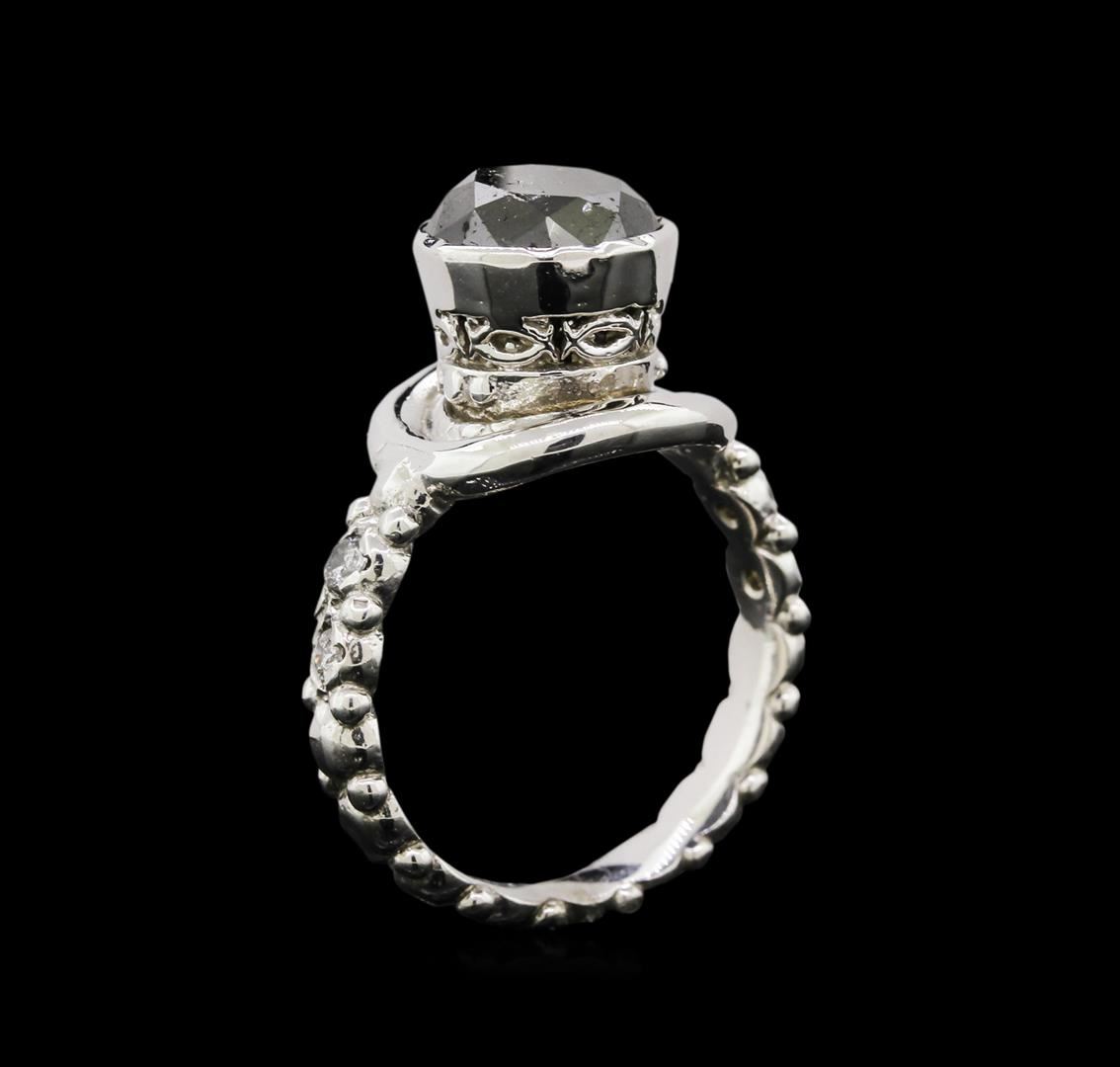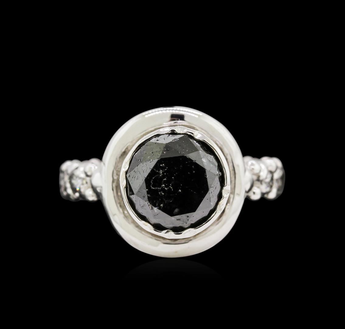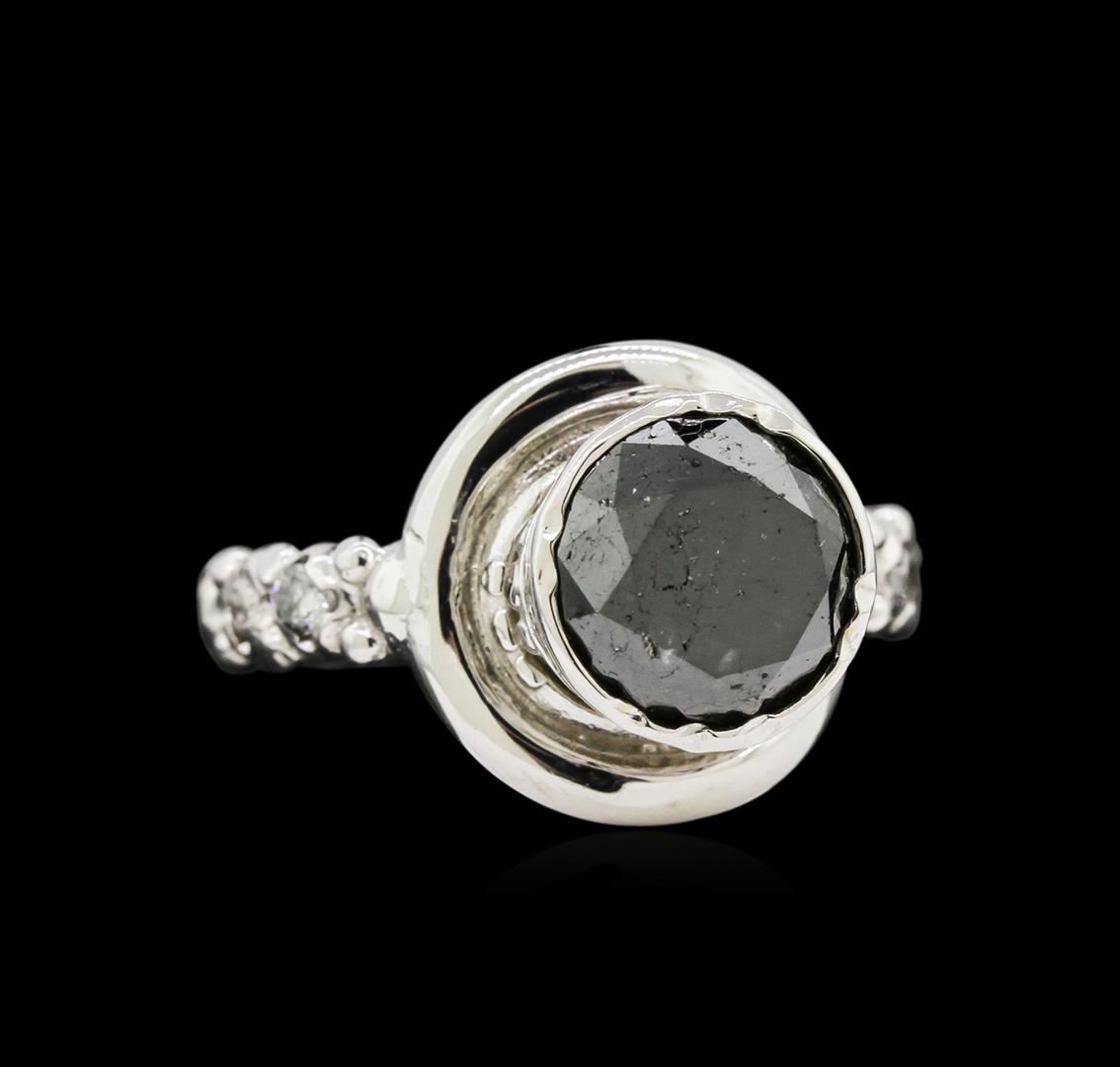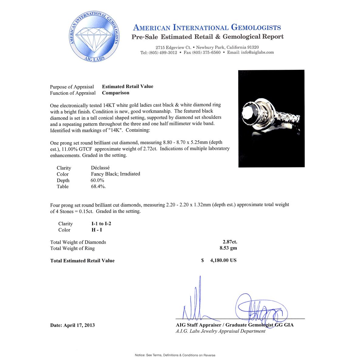 One electronically tested 14KT white gold ladies cast black and white diamond ring with a bright finish. Condition is new, good workmanship. The featured black diamond is set in a tall conical shaped setting, supported by diamond set shoulders and repeating pattern throughout the three and one half millimeter wide band. identified with markings of "14K". Containing: One prong set round brilliant cut diamond, measuring 8.80 - 8.70 x 5.25mm (depth est.), 11.00% GTCF approximate weight of 2.72ct. Indications of multiple laboratory enhancements. Graded in the setting. Clarity Declasse. Color Fancy Black; Irradiated. Depth 60.0%. Table 68.4%. Four prong set round brilliant cut diamonds, measuring 2.20 - 2.20 x 1.32mm (depth est.) approximate total weight of 4 Stones = 0.15ct. Graded in the setting. Clarity I-1 to I-2. Color H - I. Total Weight of Diamonds 2.87ct. Total Weight of Ring 8.53 gm. AIG Appraised at $4,180.00.