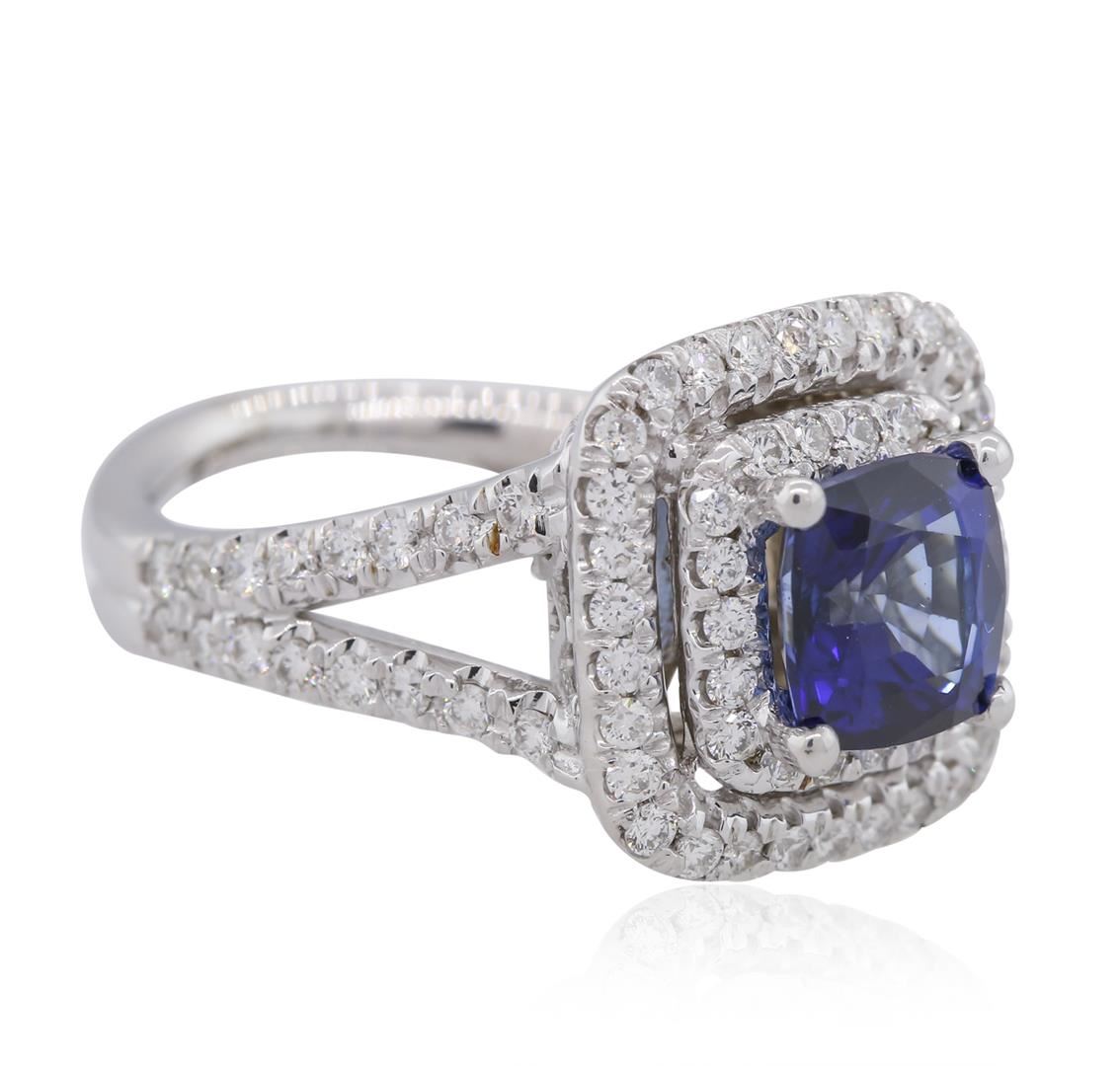 One electronically tested 14KT white gold ladies combination cast & assembled sapphire and diamond ring with a bright polish finish. Condition is new. Containing: One prong set square cushion modified brilliant cut natural blue sapphire, measuring 7.63 x 7.58 x 5.00mm, approximate weight of 2.72ct., clarity is eye clean, type II, medium dark, moderately strong, blue color, (GIA B 6/4), cut is good. Eighty prong set round brilliant cut diamonds, measuring 1.50 - 1.50 x 0.90mm (depth est.) approximate total weight of 80 Stones = 0.98ct. Clarity: SI-2 to I-1. Color: I - J, Cut is Good. Colored gemstones are presumed to have been subjected to commonly used enhancement processes. All diamonds and colored gemstones are graded in the mounting, unless otherwise stated. Total Weight of Colored Stones 2.72ct. Total Weight of Diamonds 0.98ct. Total Weight of Ring 11.40 grams. GGL Appraised at $7,650.00.