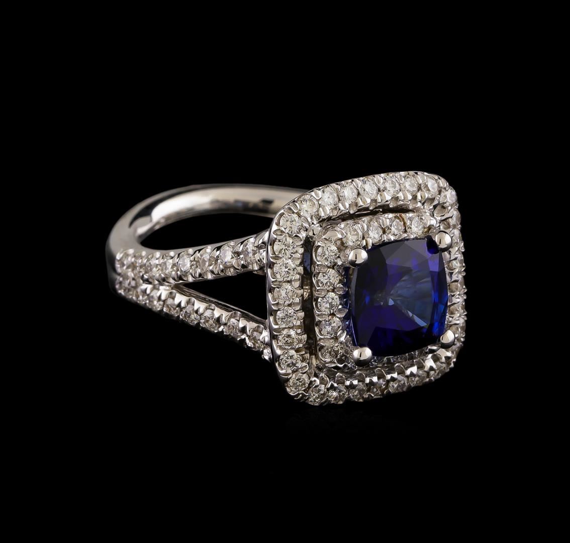 One electronically tested 14KT white gold ladies combination cast & assembled sapphire and diamond ring with a bright polish finish. Condition is new. Containing: One prong set square cushion modified brilliant cut natural blue sapphire, measuring 7.63 x 7.58 x 5.00mm, approximate weight of 2.72ct., clarity is eye clean, type II, medium dark, moderately strong, blue color, (GIA B 6/4), cut is good. Eighty prong set round brilliant cut diamonds, measuring 1.50 - 1.50 x 0.90mm (depth est.) approximate total weight of 80 Stones = 0.98ct. Clarity: SI-2 to I-1. Color: I - J, Cut is Good. Colored gemstones are presumed to have been subjected to commonly used enhancement processes. All diamonds and colored gemstones are graded in the mounting, unless otherwise stated. Total Weight of Colored Stones 2.72ct. Total Weight of Diamonds 0.98ct. Total Weight of Ring 11.40 grams. GGL Appraised at $7,650.00.