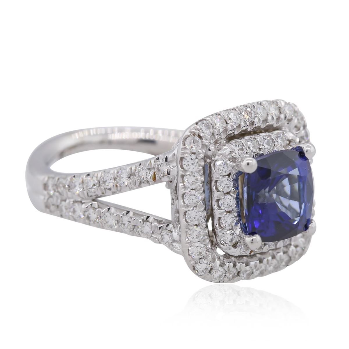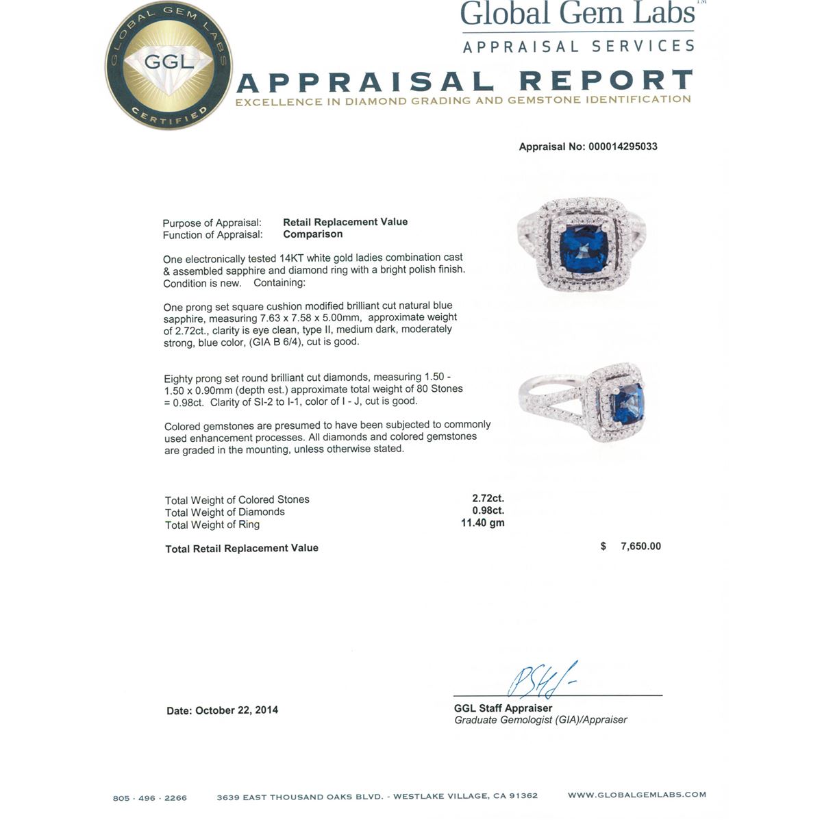One electronically tested 14KT white gold ladies combination cast & assembled sapphire and diamond ring with a bright polish finish. Condition is new. Containing: One prong set square cushion modified brilliant cut natural blue sapphire, measuring 7.63 x 7.58 x 5.00mm, approximate weight of 2.72ct., clarity is eye clean, type II, medium dark, moderately strong, blue color, (GIA B 6/4), cut is good. Eighty prong set round brilliant cut diamonds, measuring 1.50 - 1.50 x 0.90mm (depth est.) approximate total weight of 80 Stones = 0.98ct. Clarity: SI-2 to I-1. Color: I - J, Cut is Good. Colored gemstones are presumed to have been subjected to commonly used enhancement processes. All diamonds and colored gemstones are graded in the mounting, unless otherwise stated. Total Weight of Colored Stones 2.72ct. Total Weight of Diamonds 0.98ct. Total Weight of Ring 11.40 grams. GGL Appraised at $7,650.00.