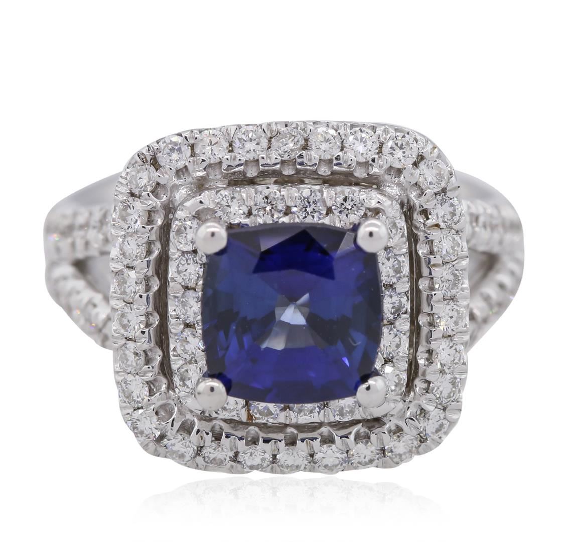 One electronically tested 14KT white gold ladies combination cast & assembled sapphire and diamond ring with a bright polish finish. Condition is new. Containing: One prong set square cushion modified brilliant cut natural blue sapphire, measuring 7.63 x 7.58 x 5.00mm, approximate weight of 2.72ct., clarity is eye clean, type II, medium dark, moderately strong, blue color, (GIA B 6/4), cut is good. Eighty prong set round brilliant cut diamonds, measuring 1.50 - 1.50 x 0.90mm (depth est.) approximate total weight of 80 Stones = 0.98ct. Clarity: SI-2 to I-1. Color: I - J, Cut is Good. Colored gemstones are presumed to have been subjected to commonly used enhancement processes. All diamonds and colored gemstones are graded in the mounting, unless otherwise stated. Total Weight of Colored Stones 2.72ct. Total Weight of Diamonds 0.98ct. Total Weight of Ring 11.40 grams. GGL Appraised at $7,650.00.