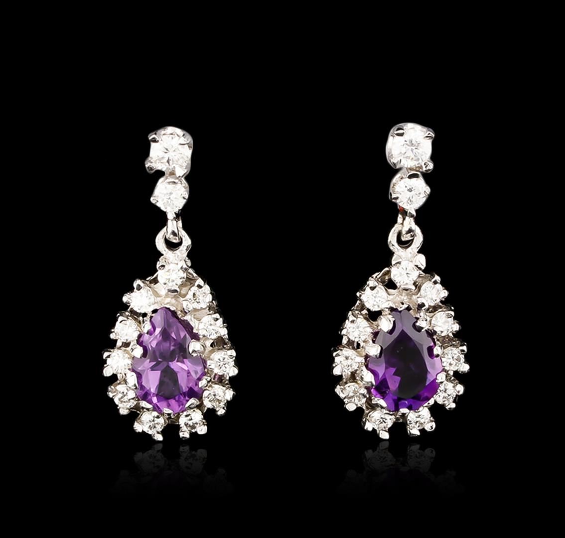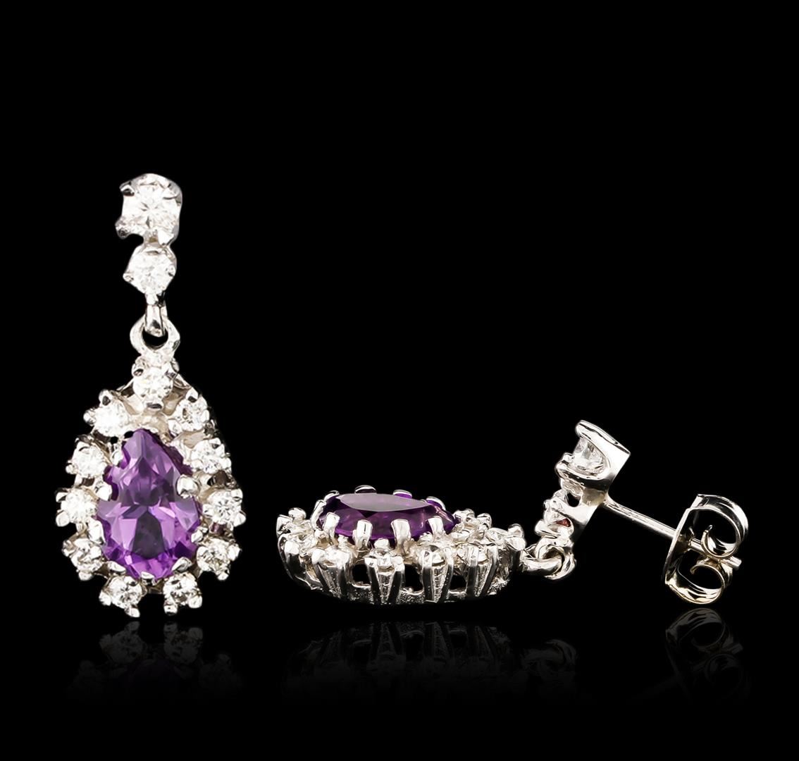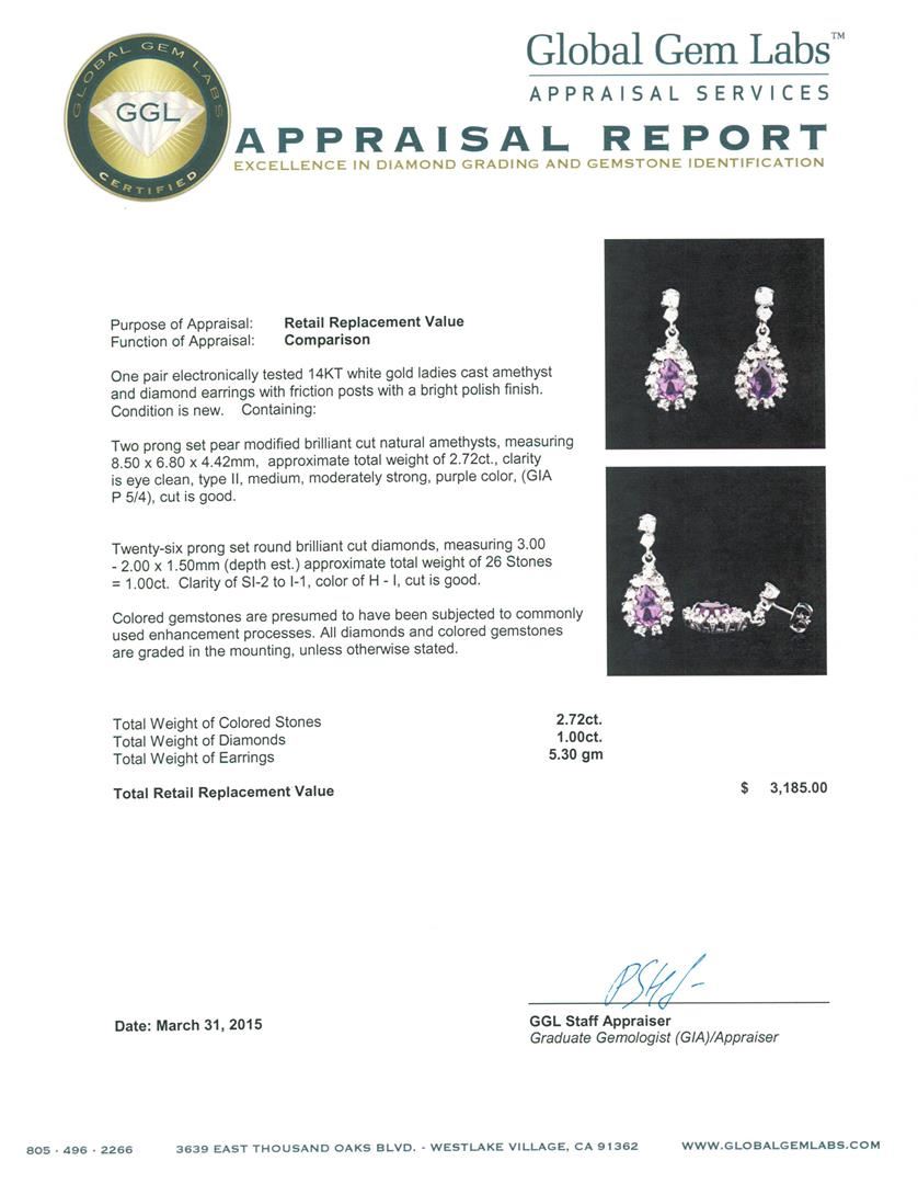 One pair electronically tested 14KT white gold ladies cast amethyst and diamond earrings with friction posts with a bright polish finish. Condition is new. Containing: Two prong set pear modified brilliant cut natural amethysts, measuring 8.50 x 6.80 x 4.42mm, approximate total weight of 2.72ct., clarity is eye clean, type II, medium, moderately strong, purple color, (GIA P 5/4), cut is good. Twenty-Six prong set round brilliant cut diamonds, measuring 3.00. - 2.00. x 1.50mm (depth est.) approximate total weight of 26 Stones = 1.00ct. Clarity: SI-2 to I-1. Color: H - I, Cut is Good. Colored gemstones are presumed to have been subjected to commonly used enhancement processes. All diamonds and colored gemstones are graded in the mounting, unless otherwise stated. Total Weight of Colored Stones 2.72ct. Total Weight of Diamonds 1.00ct. Total Weight of Earrings 5.30 grams. GGL Appraised at $3,185.00.