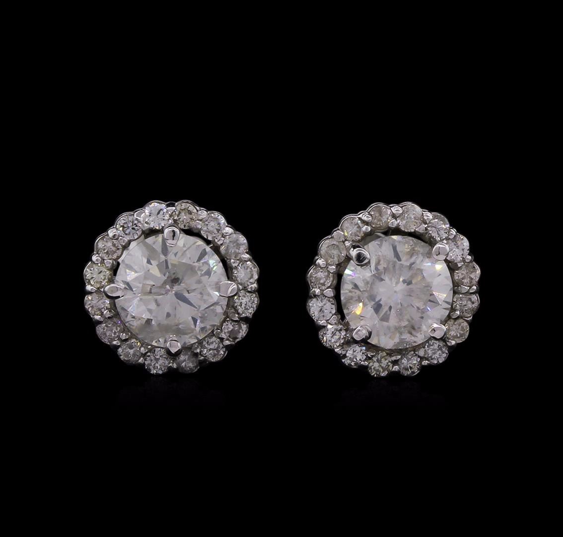 One pair electronically tested 14KT White Gold ladies cast & assembled diamond earrings with standard backs. Condition is good. Bright polish finish. Identified with markings of "585". Containing: Two prong set round brilliant cut diamonds, measuring 6.60 - 6.50 x 3.93mm (depth est.) approximate. Total Weight of 2 Stones = 2.24ct. The color grade reflects the average for the pair. Graded in the setting. Clarity: I-1 to I-2. Color: I. Thirty-Two prong set round brilliant cut diamonds, measuring 1.50 - 1.40 x 0.87mm (depth est.) approximate. Total Weight of 32 Stones = 0.49ct. Graded in the setting. Clarity: SI-2 to I-1. Color: H - I. Total Weight of Diamonds 2.73ct. AIG Appraised at $29,575.00.