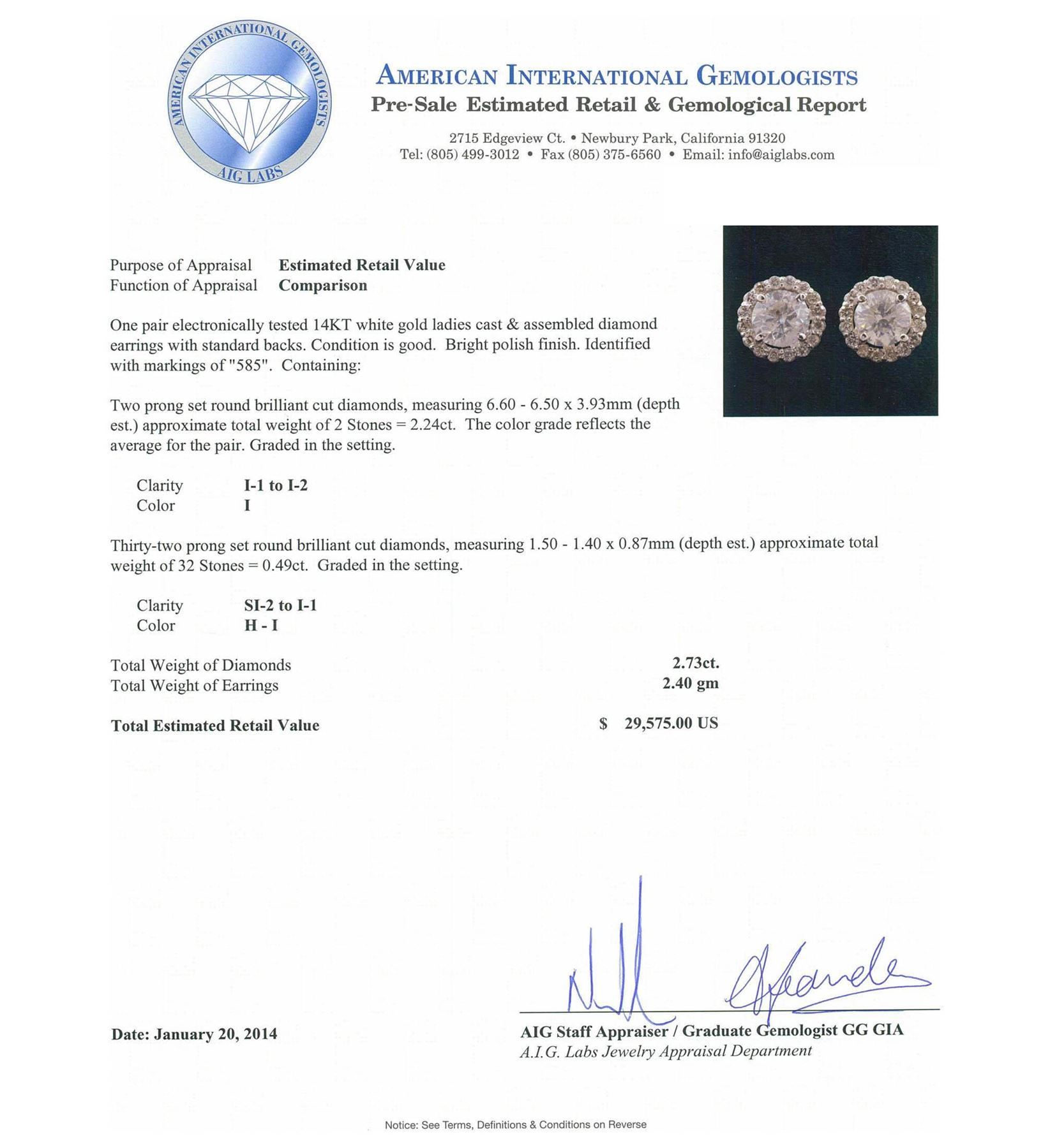 One pair electronically tested 14KT White Gold ladies cast & assembled diamond earrings with standard backs. Condition is good. Bright polish finish. Identified with markings of "585". Containing: Two prong set round brilliant cut diamonds, measuring 6.60 - 6.50 x 3.93mm (depth est.) approximate. Total Weight of 2 Stones = 2.24ct. The color grade reflects the average for the pair. Graded in the setting. Clarity: I-1 to I-2. Color: I. Thirty-Two prong set round brilliant cut diamonds, measuring 1.50 - 1.40 x 0.87mm (depth est.) approximate. Total Weight of 32 Stones = 0.49ct. Graded in the setting. Clarity: SI-2 to I-1. Color: H - I. Total Weight of Diamonds 2.73ct. AIG Appraised at $29,575.00.