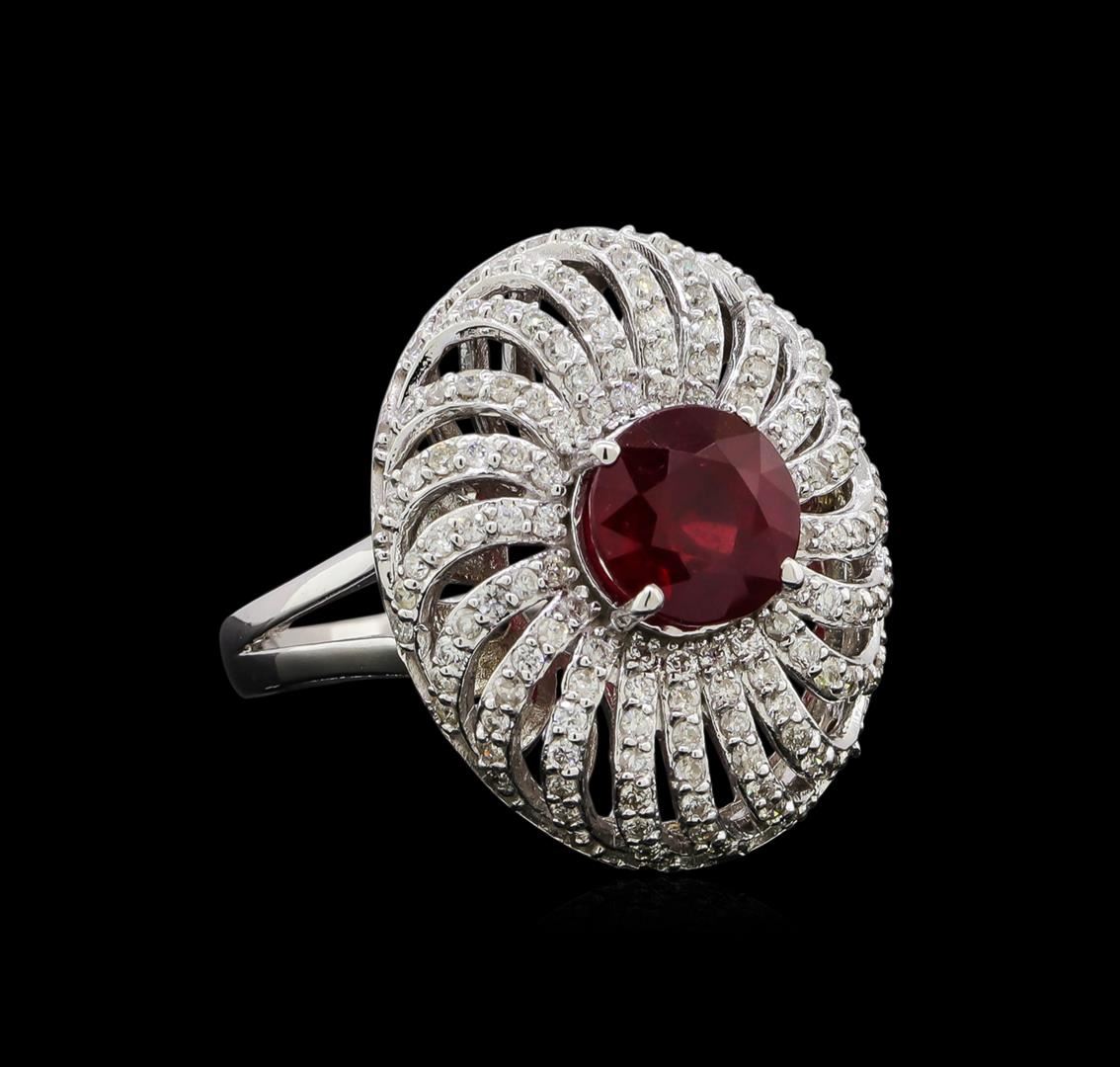 One electronically tested 14KT white gold ladies cast ruby and diamond ring with a bright polish finish. Identified with markings of "K14". Condition is new. Containing: One prong set round modified brilliant cut ruby, measuring 7.50 - 7.50 x 4.88 mm, approximate weight of 2.73ct., clarity is heavily included, type II, medium, very slightly brownish, strongly purplish red color, (GIA stpR 5/3), cut is good. One Hundred Sixty prong set round brilliant cut diamonds, measuring 1.10 - 1.10 x 0.66mm (depth est.) approximate total weight of 160 Stones = 0.98ct. Clarity: I-1 to I-2. Color: H - I, Cut is Good. Colored gemstones are presumed to have been subjected to commonly used enhancement processes. All diamonds and colored gemstones are graded in the mounting, unless otherwise stated. Total Weight of Colored Stones 2.73ct. Total Weight of Diamonds 0.98ct. Total Weight of Ring 8.30 grams. GGL Appraised.