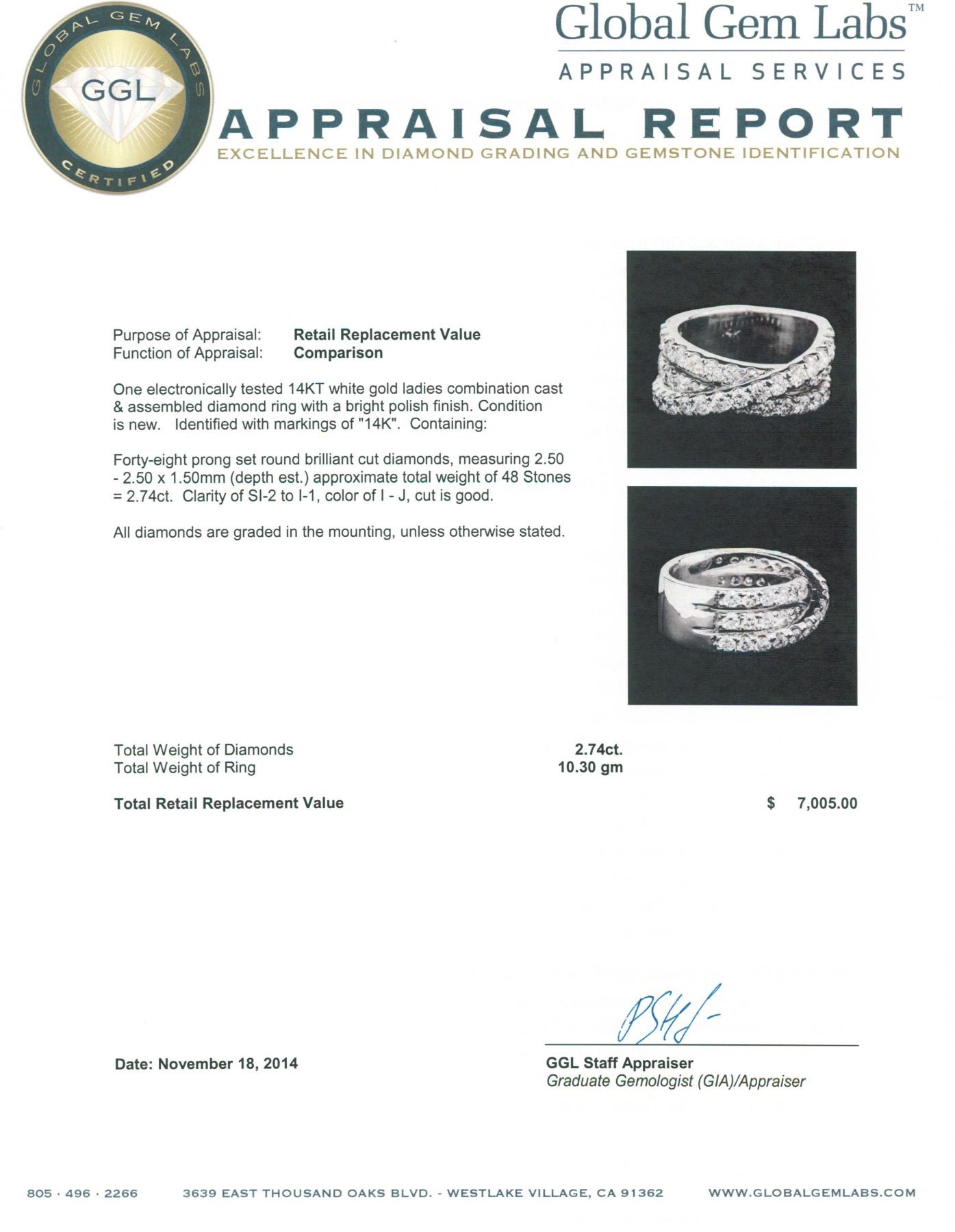 One electronically tested 14KT white gold ladies combination cast & assembled diamond ring with a bright polish finish. Identified with markings of "14K". Condition is new. Containing: Forty-Eight prong set round brilliant cut diamonds, measuring 2.50 - 2.50 x 1.50mm (depth est.) approximate total weight of 48 Stones = 2.74ct. Clarity: SI-2 to I-1. Color: I - J, Cut is Good. All diamonds are graded in the mounting, unless otherwise stated. Total Weight of Diamonds 2.74ct. Total Weight of Ring 10.30 grams. GGL Appraised.