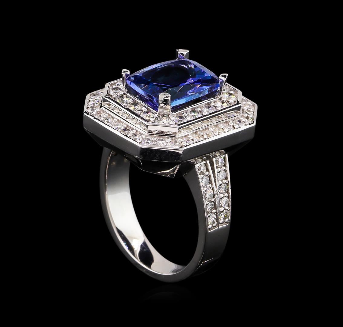 One electronically tested 14KT white gold Ladies combination cast & assembled ring with a bright polish finish. Condition is new. Identified with markings of "14K". Containing: One prong set rectangular cushion modified brilliant cut natural tanzanite, measuring 10.00 x 8.10 x 4.30mm, approximate weight of 2.74ct., clarity is eye clean, type I, medium light, very slightly grayish, violet color, (GIA V 4/3), cut is good. Colored gemstones are presumed to have been subjected to commonly used color/clarity enhancement processes. Seventy-Two prong set round brilliant cut diamonds, measuring 1.80 - 1.50 x 0.99mm (depth est.) approximate. Total Weight of 72 Stones = 1.18ct. Clarity: I-1 to I-2. Color: I - J, Cut is Good. Total Weight of Colored Stones 2.74ct. Total Weight of Diamonds 1.18ct. Total Weight of Ring 12.50 grams. GGL Appraised.