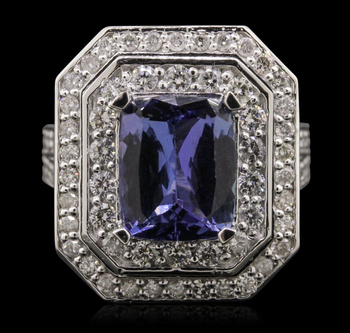 One electronically tested 14KT white gold Ladies combination cast & assembled ring with a bright polish finish. Condition is new. Identified with markings of "14K". Containing: One prong set rectangular cushion modified brilliant cut natural tanzanite, measuring 10.00 x 8.10 x 4.30mm, approximate weight of 2.74ct., clarity is eye clean, type I, medium light, very slightly grayish, violet color, (GIA V 4/3), cut is good. Colored gemstones are presumed to have been subjected to commonly used color/clarity enhancement processes. Seventy-Two prong set round brilliant cut diamonds, measuring 1.80 - 1.50 x 0.99mm (depth est.) approximate. Total Weight of 72 Stones = 1.18ct. Clarity: I-1 to I-2. Color: I - J, Cut is Good. Total Weight of Colored Stones 2.74ct. Total Weight of Diamonds 1.18ct. Total Weight of Ring 12.50 grams. GGL Appraised at $10,705.00.