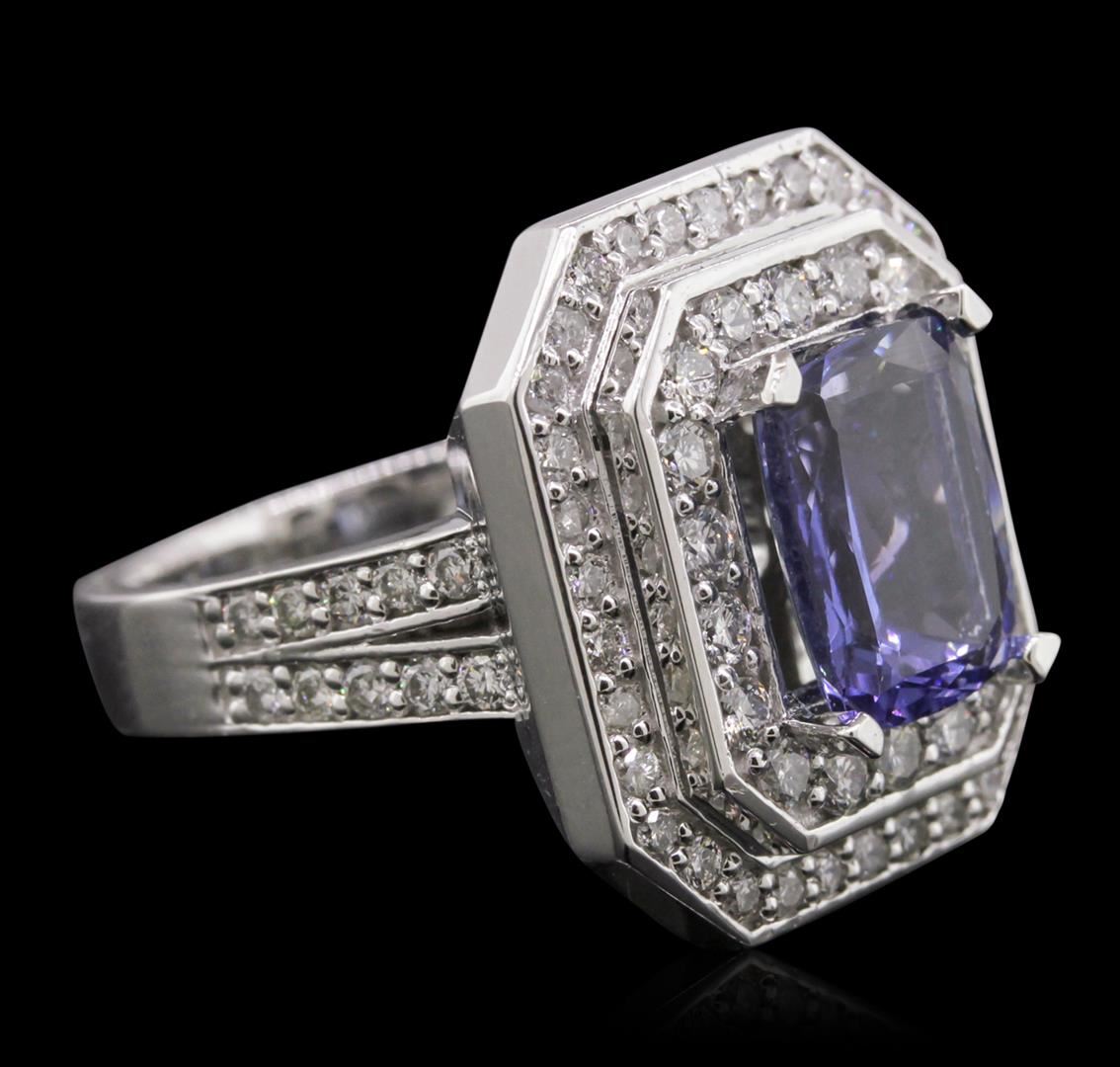 One electronically tested 14KT white gold Ladies combination cast & assembled ring with a bright polish finish. Condition is new. Identified with markings of "14K". Containing: One prong set rectangular cushion modified brilliant cut natural tanzanite, measuring 10.00 x 8.10 x 4.30mm, approximate weight of 2.74ct., clarity is eye clean, type I, medium light, very slightly grayish, violet color, (GIA V 4/3), cut is good. Colored gemstones are presumed to have been subjected to commonly used color/clarity enhancement processes. Seventy-Two prong set round brilliant cut diamonds, measuring 1.80 - 1.50 x 0.99mm (depth est.) approximate. Total Weight of 72 Stones = 1.18ct. Clarity: I-1 to I-2. Color: I - J, Cut is Good. Total Weight of Colored Stones 2.74ct. Total Weight of Diamonds 1.18ct. Total Weight of Ring 12.50 grams. GGL Appraised at $10,705.00.