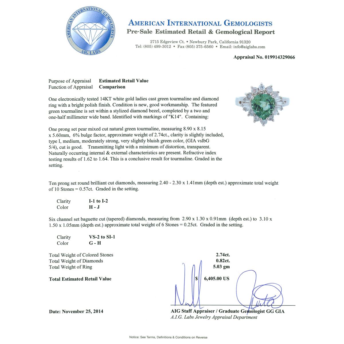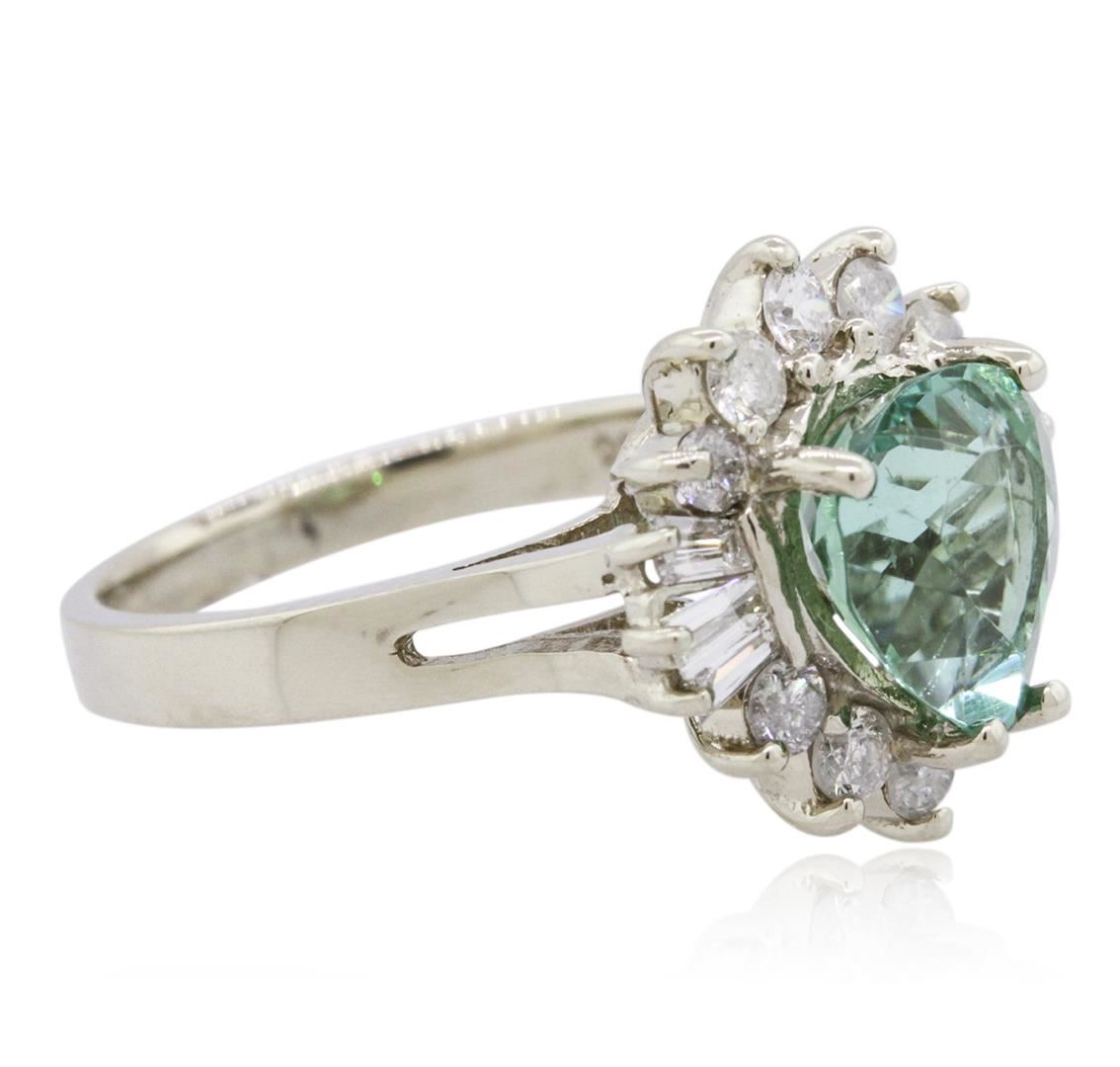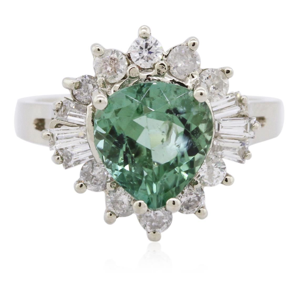 One electronically tested 14KT white gold ladies cast green tourmaline and diamond ring with a bright polish finish. The featured green tourmaline is set within a stylized diamond bezel, completed by a two and one-half millimeter wide band. Identified with markings of "K14". Condition is new, good workmanship. Containing: One prong set pear mixed cut natural green tourmaline, measuring 8.90 x 8.15 x 5.60mm, 6%. bulge factor, approximate weight of 2.74ct., clarity is slightly included, type I, medium, moderately strong, very slightly bluish green color, (GIA vslbG 5/4), cut is good. Transmitting light with a minimum of distortion, transparent. Naturally occurring internal & external characteristics are present. Refractive index testing results of 1.62 to 1.64. This is a conclusive result for tourmaline. Graded in the setting. Ten prong set round brilliant cut diamonds, measuring 2.40 - 2.30 x 1.41mm (depth est.) approximate total weight of 10 Stones = 0.57ct. Graded in the setting. Clarity: I-1 to I-2. Color: H - J Six channel set baguette cut (tapered) diamonds, measuring from 2.90 x 1.30 x 0.91mm (depth est.) to 3.10 x 1.50 x 1.05mm (depth est.) approximate total weight of 6 Stones = 0.25ct. Graded in the setting. Clarity: VS-2 to SI-1. Color: G - H. Total Weight of Colored Stones 2.74ct. Total Weight of Diamonds 0.82ct. Total Weight of Ring 5.03 grams. AIG Appraised at $6,405.00.