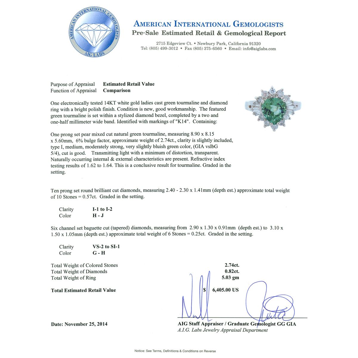 One electronically tested 14KT white gold ladies cast green tourmaline and diamond ring with a bright polish finish. The featured green tourmaline is set within a stylized diamond bezel, completed by a two and one-half millimeter wide band. Identified with markings of "K14". Condition is new, good workmanship. Containing: One prong set pear mixed cut natural green tourmaline, measuring 8.90 x 8.15 x 5.60mm, 6%. bulge factor, approximate weight of 2.74ct., clarity is slightly included, type I, medium, moderately strong, very slightly bluish green color, (GIA vslbG 5/4), cut is good. Transmitting light with a minimum of distortion, transparent. Naturally occurring internal & external characteristics are present. Refractive index testing results of 1.62 to 1.64. This is a conclusive result for tourmaline. Graded in the setting. Ten prong set round brilliant cut diamonds, measuring 2.40 - 2.30 x 1.41mm (depth est.) approximate total weight of 10 Stones = 0.57ct. Graded in the setting. Clarity: I-1 to I-2. Color: H - J Six channel set baguette cut (tapered) diamonds, measuring from 2.90 x 1.30 x 0.91mm (depth est.) to 3.10 x 1.50 x 1.05mm (depth est.) approximate total weight of 6 Stones = 0.25ct. Graded in the setting. Clarity: VS-2 to SI-1. Color: G - H. Total Weight of Colored Stones 2.74ct. Total Weight of Diamonds 0.82ct. Total Weight of Ring 5.03 grams. AIG Appraised at $6,405.00.