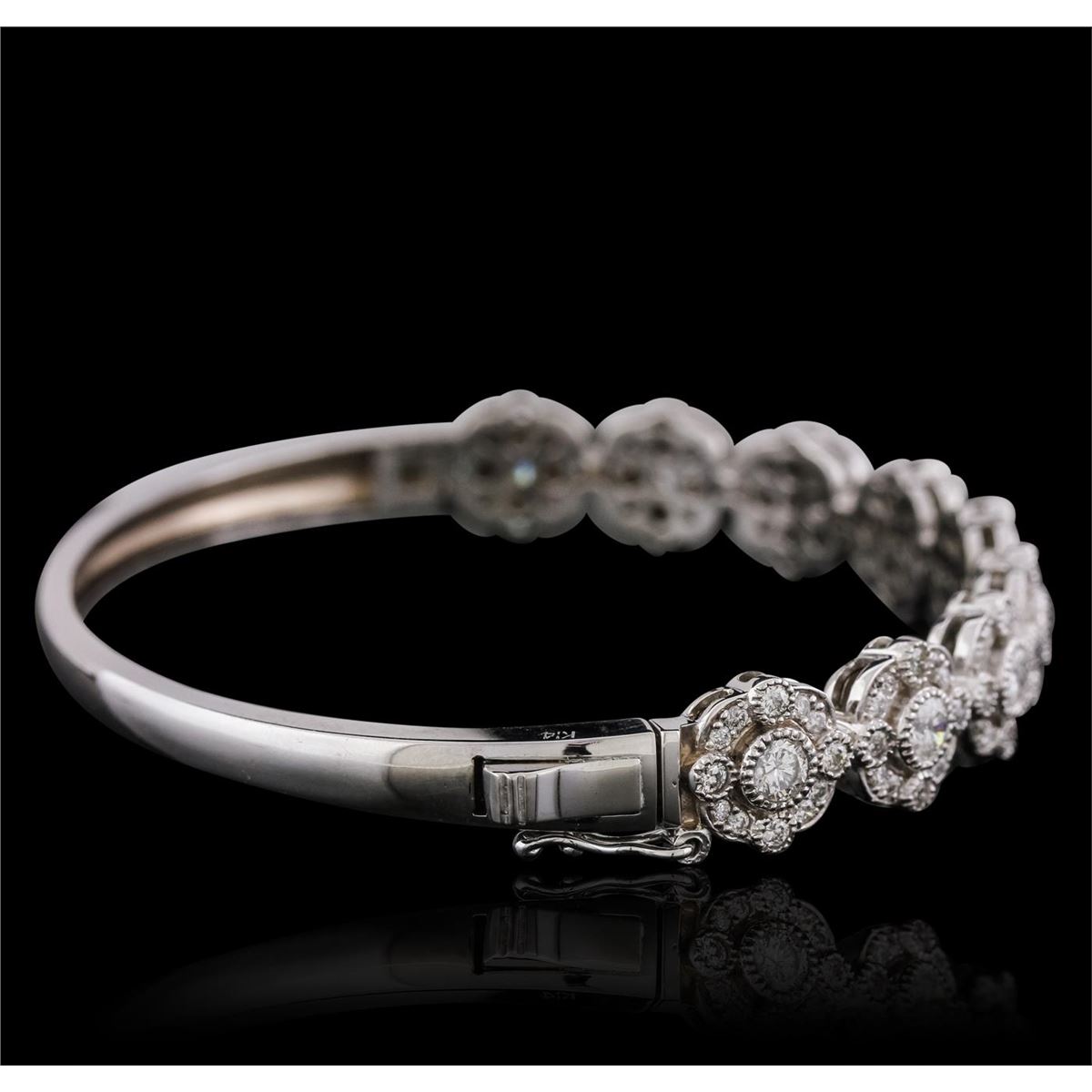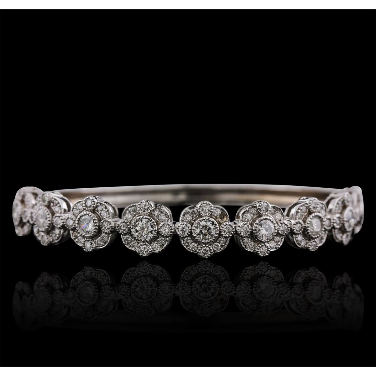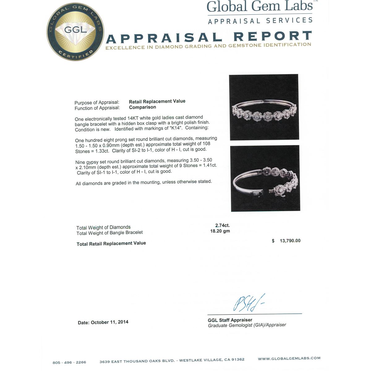 One electronically tested 14KT white gold ladies cast diamond bangle bracelet with a hidden box clasp with a bright polish finish. Identified with markings of "K14". Condition is new. Containing: One Hundred Eight prong set round brilliant cut diamonds, measuring 1.50 - 1.50 x 0.90mm (depth est.) approximate total weight of 108 Stones = 1.33ct. Clarity: SI-2 to I-1. Color: H - I, Cut is Good. Nine gypsy set round brilliant cut diamonds, measuring 3.50 - 3.50 x 2.10mm (depth est.) approximate total weight of 9 Stones = 1.41ct. Clarity: SI-1 to I-1. Color: H - I, Cut is Good. All diamonds are graded in the mounting, unless otherwise stated. Total Weight of Diamonds 2.74ct. Total Weight of Bangle Bracelet 18.20 grams. GGL Appraised at $13,790.00.