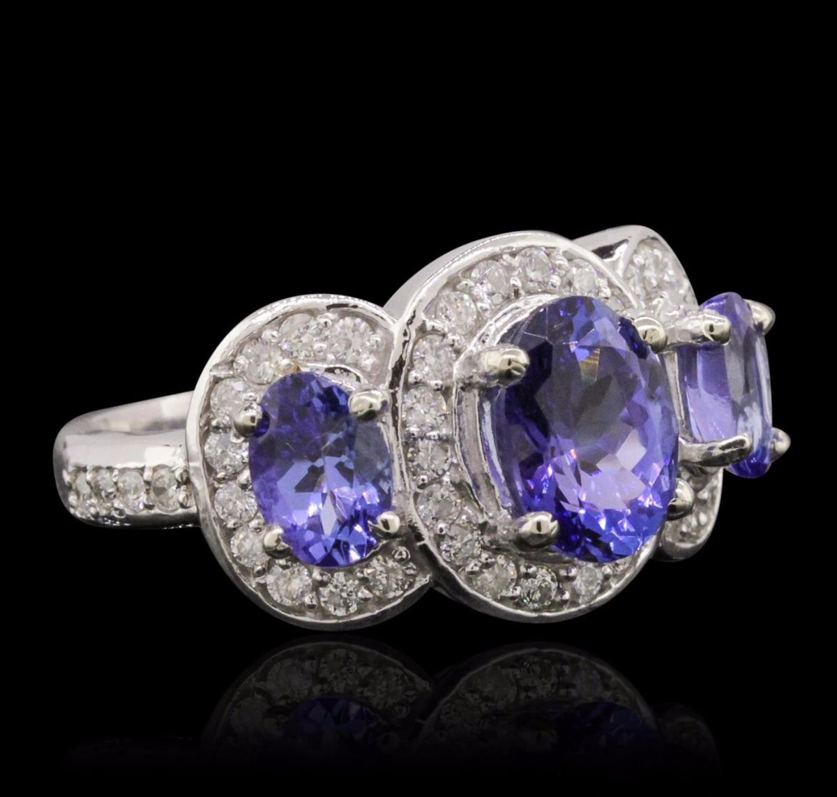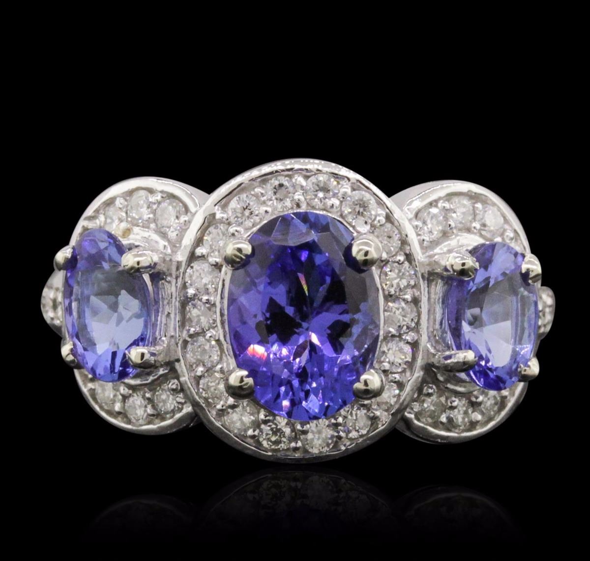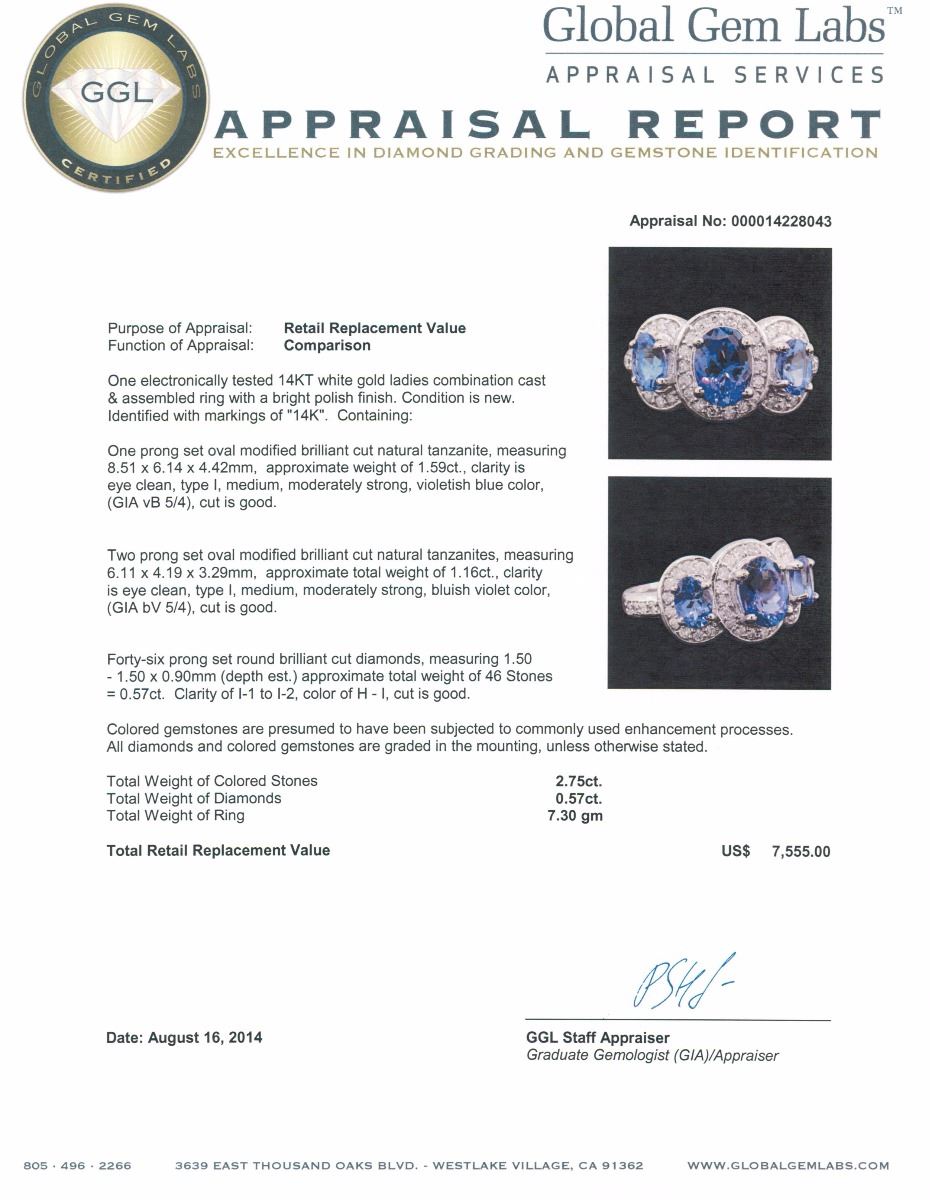One electronically tested 14KT white gold ladies combination cast & assembled ring with a bright polish finish. Condition is new. Identified with markings of "14K". Containing: One prong set oval modified brilliant cut natural tanzanite, measuring 8.51 x 6.14 x 4.42mm, approximate weight of 1.59ct., clarity is eye clean, type I, medium, moderately strong, violetish blue color, (GIA vB 5/4), cut is good. Two prong set oval modified brilliant cut natural tanzanites, measuring 6.11 x 4.19 x 3.29mm, approximate. Total Weight of 1.16ct., clarity is eye clean, type I, medium, moderately strong, bluish violet color, (GIA bV 5/4), cut is good. Forty-Six prong set round brilliant cut diamonds, measuring 1.50 - 1.50 x 0.90mm (depth est.) approximate. Total Weight of 46 Stones = 0.57ct. Clarity: I-1 to I-2. Color: H - I, Cut is Good. Colored gemstones are presumed to have been subjected to commonly used enhancement processes. All diamonds and colored gemstones are graded in the mounting, unless otherwise stated. Total Weight of Colored Stones 2.75ct. Total Weight of Diamonds 0.57ct. Total Weight of Ring 7.30 grams. GGL Appraised at $7,555.00.