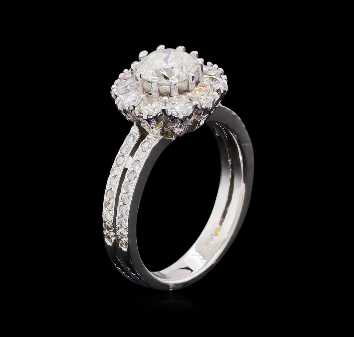 One electronically tested 14KT white gold ladies cast & assembled diamond ring. Condition is good. The featured diamond is set within a diamond bezel supported by diamond set split shoulders, completed by a three and one-half millimeter wide band. Bright polish finish with milgrain detailing. Identified with markings of "14K". Containing: One prong set round brilliant cut diamond, measuring 6.50 - 6.40 x 3.80mm (depth est.), 5.00% GTCF approximate weight of 1.01ct with a medium blue fluorescence. Diamond Grading Report attached. Graded in the setting. Clarity I-1 Color J Depth 58.9% Table 62.0% Ten prong set round brilliant cut diamonds, measuring 2.90 - 2.80 x 1.71mm (depth est.) approximate total weight of 10 Stones = 0.90ct. Graded in the setting. Clarity VS-1 to SI-1 Color H - J Forty prong set round brilliant cut diamonds, measuring 1.80 - 1.80 x 1.08mm (depth est.) approximate total weight of 40 Stones = 0.85ct. Graded in the setting. Clarity SI-1 to I-1 Color H - J Total Weight of Diamonds 2.76ct. Total Weight of Ring 5.62 grams. AIG appraised at $19,110.00. AIG Appraised at $19,110.00.