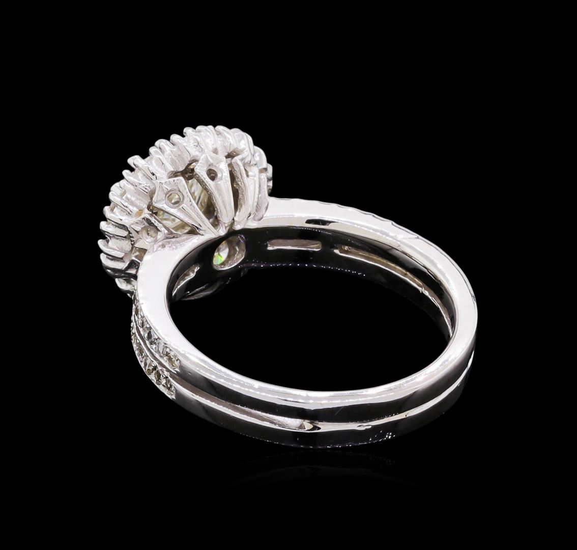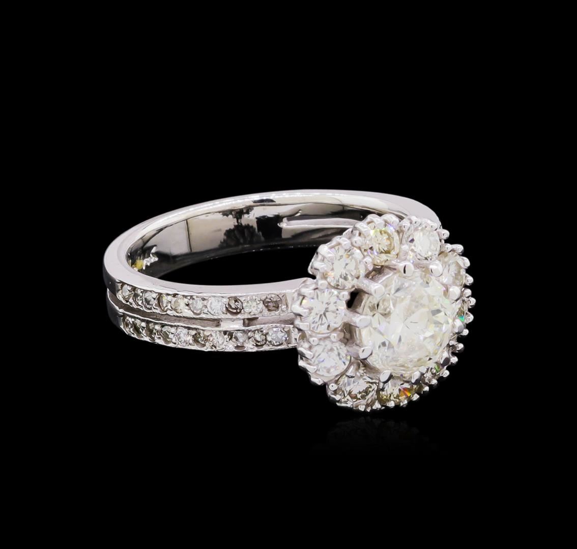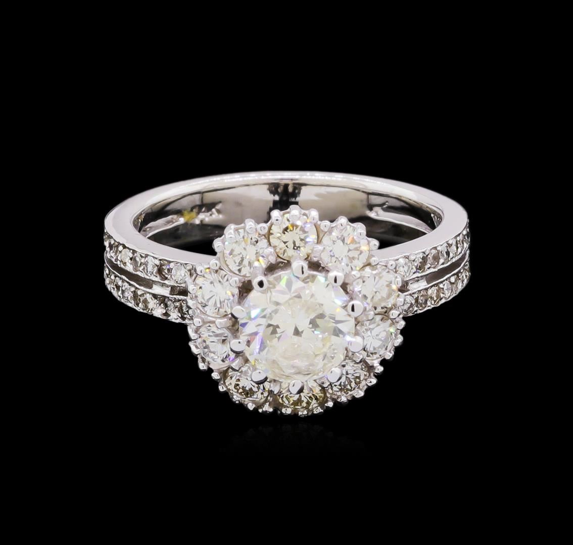 One electronically tested 14KT white gold ladies cast & assembled diamond ring. Condition is good. The featured diamond is set within a diamond bezel supported by diamond set split shoulders, completed by a three and one-half millimeter wide band. Bright polish finish with milgrain detailing. Identified with markings of "14K". Containing: One prong set round brilliant cut diamond, measuring 6.50 - 6.40 x 3.80mm (depth est.), 5.00% GTCF approximate weight of 1.01ct with a medium blue fluorescence. Diamond Grading Report attached. Graded in the setting. Clarity I-1 Color J Depth 58.9% Table 62.0% Ten prong set round brilliant cut diamonds, measuring 2.90 - 2.80 x 1.71mm (depth est.) approximate total weight of 10 Stones = 0.90ct. Graded in the setting. Clarity VS-1 to SI-1 Color H - J Forty prong set round brilliant cut diamonds, measuring 1.80 - 1.80 x 1.08mm (depth est.) approximate total weight of 40 Stones = 0.85ct. Graded in the setting. Clarity SI-1 to I-1 Color H - J Total Weight of Diamonds 2.76ct. Total Weight of Ring 5.62 grams. AIG appraised at $19,110.00. AIG Appraised at $19,110.00.