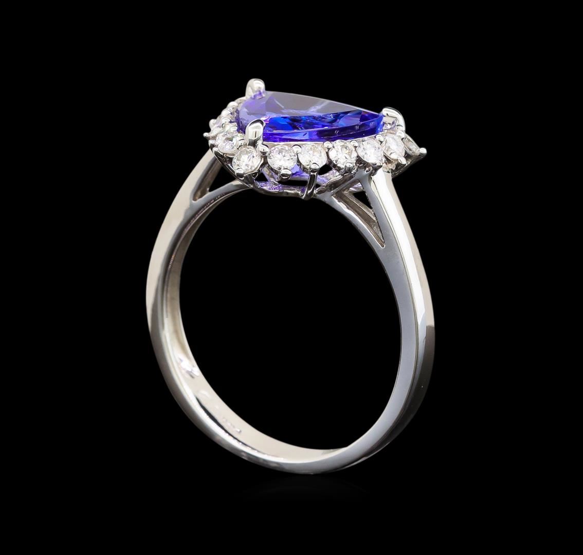 One electronically tested 14KT white gold ladies cast tanzanite and diamond ring with a cathedral shank with a bright polish finish. Trademark is Orianne. Identified with markings of "14K". Condition is new. Containing: One prong set triangle modified brilliant cut natural tanzanite, measuring 10.00 x 10.00 x 4.58mm, approximate weight of 2.76ct., clarity is eye clean, type I, medium light, very slightly grayish, violet color, (GIA V 4/3), cut is good. Eighteen prong set round brilliant cut diamonds, measuring 1.50 - 1.50 x 0.90mm (depth est.) approximate total weight of 18 Stones = 0.22ct. Clarity: SI-2 to I-1. Color: I - J, Cut is Good. All diamonds and colored gemstones are graded in the mounting, unless otherwise stated. Colored gemstones are presumed to have been subjected to commonly used enhancement processes. Total Weight of Colored Stones 2.76ct. Total Weight of Diamonds 0.22ct. Total Weight of Ring 3.10 grams. GGL Appraised at $3,495.00.
