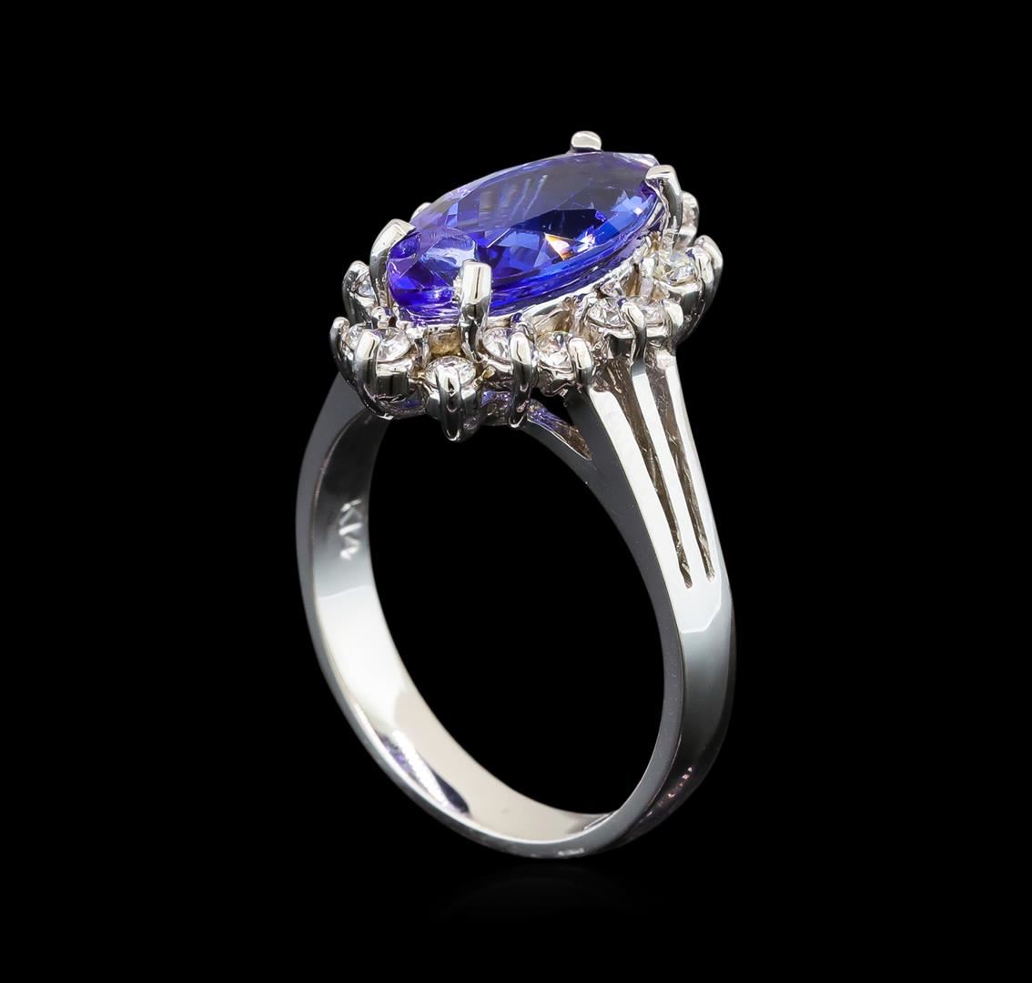 One electronically tested 14KT white gold ladies cast tanzanite and diamond ring with a bright polish finish. Identified with markings of "K14". Condition is new. Containing: One prong set marquise modified brilliant cut natural tanzanite, measuring 14.00 x 7.20 x 4.30mm, approximate weight of 2.76ct., clarity is eye clean, type I, medium, very slightly grayish, bluish violet color, (GIA bV 5/3), cut is good. Sixteen prong set round brilliant cut diamonds, measuring 2.00 - 2.00 x 1.20mm (depth est.) approximate total weight of 16 Stones = 0.47ct. Clarity: SI-1 to SI-2. Color: I - J, Cut is Good. Colored gemstones are presumed to have been subjected to commonly used enhancement processes. All diamonds and colored gemstones are graded in the mounting, unless otherwise stated. Total Weight of Colored Stones 2.76ct. Total Weight of Diamonds 0.47ct. Total Weight of Ring 5.20 grams. GGL Appraised at $4,000.00.