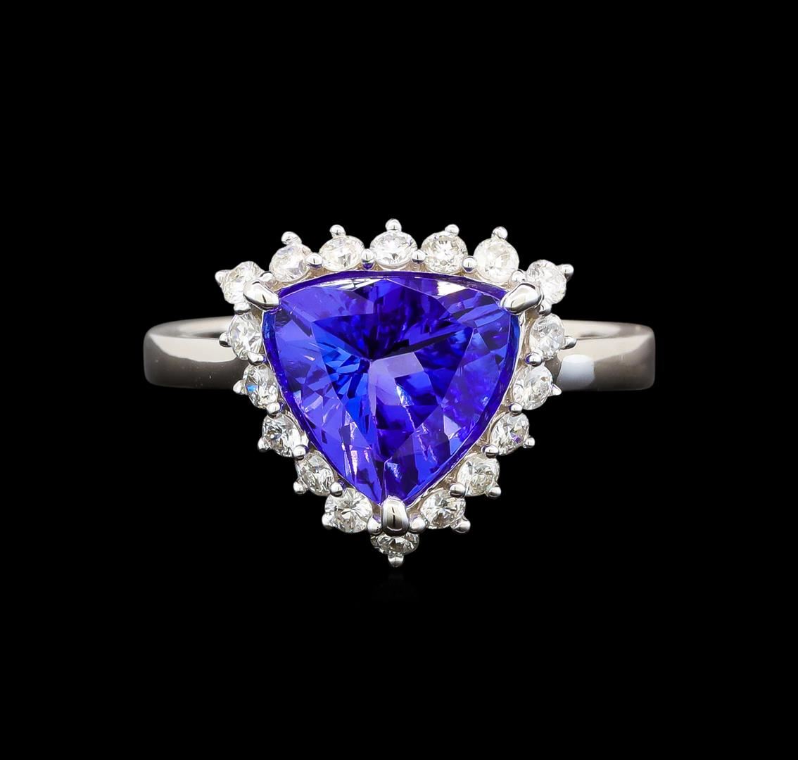One electronically tested 14KT white gold ladies cast tanzanite and diamond ring with a cathedral shank with a bright polish finish. Trademark is Orianne. Identified with markings of "14K". Condition is new. Containing: One prong set triangle modified brilliant cut natural tanzanite, measuring 10.00 x 10.00 x 4.58mm, approximate weight of 2.76ct., clarity is eye clean, type I, medium light, very slightly grayish, violet color, (GIA V 4/3), cut is good. Eighteen prong set round brilliant cut diamonds, measuring 1.50 - 1.50 x 0.90mm (depth est.) approximate total weight of 18 Stones = 0.22ct. Clarity: SI-2 to I-1. Color: I - J, Cut is Good. All diamonds and colored gemstones are graded in the mounting, unless otherwise stated. Colored gemstones are presumed to have been subjected to commonly used enhancement processes. Total Weight of Colored Stones 2.76ct. Total Weight of Diamonds 0.22ct. Total Weight of Ring 3.10 grams. GGL Appraised at $3,495.00.