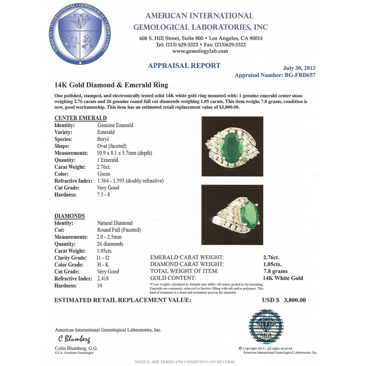 One polished, stamped, and electronically tested solid 14KT White Gold ring mounted with: 1 genuine emerald center stone weighing 2.76 carats and 26 genuine round full cut diamonds weighing 1.05 carats. This item weighs 7.8 grams, condition is new, very good workmanship. AIGL Appraised at $3,800.00.