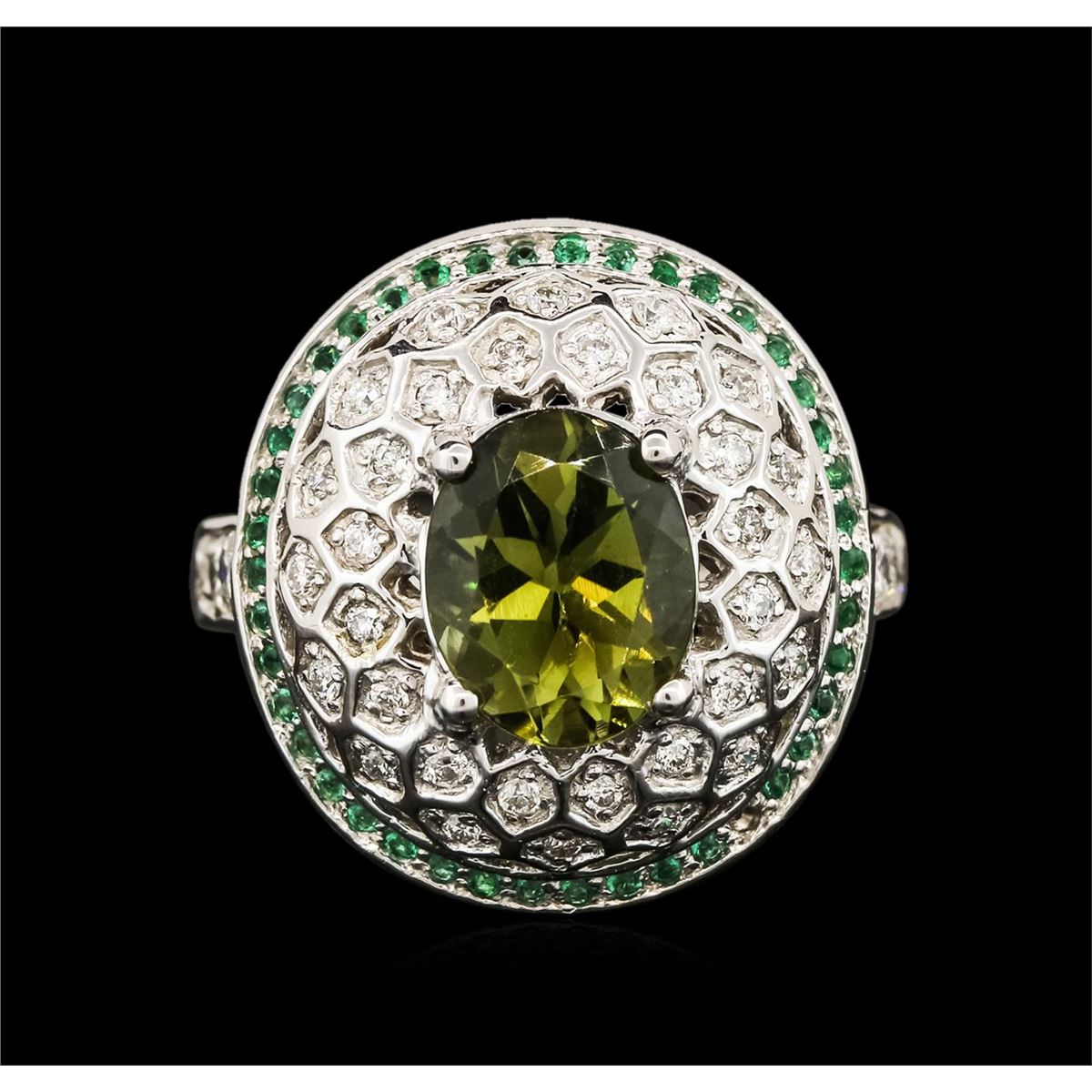 One electronically tested 14KT white gold ladies cast multi gemstone and diamond ring with a bright polish finish. The featured green tourmaline is set within tiered diamond bezels and an outer green chrysoberyl bezel supported by diamond set shoulders, completed by a two millimeter wide band. Condition is new, good workmanship. Containing: One prong set oval mixed cut natural green tourmaline, measuring 9.80 x 7.80 x 5.50mm, 6% bulge factor, approximate weight of 2.76ct., clarity is eye clean, type I, medium dark, very slightly grayish, slightly yellowish green color, (GIA slyG 6/3), cut is good. Transmitting light with no distortion, transparent. Refractive index testing results of 1.62 to 1.64. This is a conclusive result for tourmaline. Graded in the setting. Forty-two prong set round mixed cut natural green chrysoberyls, measuring 1.00 - 1.00 x 0.65 mm, approximate total weight of 0.52ct., clarity is slightly included, medium dark, moderately strong, bluish green color, (GIA bG 6/4), cut is good. Transmitting light with a minimum of distortion, transparent. Naturally occurring internal & external characteristics are present. Color grade is an average for the group. Graded in the setting. Six prong set round brilliant cut diamonds, measuring 2.50 - 2.40 x 1.47mm (depth est.) approximate total weight of 6 Stones = 0.35ct. Graded in the setting. Clarity: SI-2 to I-1. Color: G - I Thirty-Two prong set round brilliant cut diamonds, measuring 1.40 - 1.30 x 0.81mm (depth est.) approximate total weight of 32 Stones = 0.38ct. Graded in the setting. Clarity: SI-1 to SI-2. Color: G - I. Total Weight of Colored Stones 3.28ct. Total Weight of Diamonds 0.73ct. Total Weight of Ring 9.19 grams. AIG Appraised at $4,505.00.