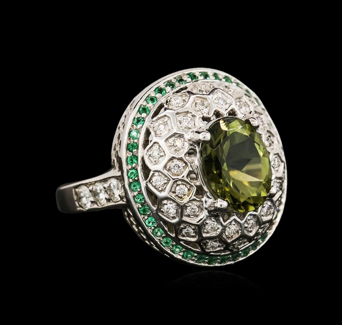 One electronically tested 14KT white gold ladies cast multi gemstone and diamond ring with a bright polish finish. The featured green tourmaline is set within tiered diamond bezels and an outer green chrysoberyl bezel supported by diamond set shoulders, completed by a two millimeter wide band. Condition is new, good workmanship. Containing: One prong set oval mixed cut natural green tourmaline, measuring 9.80 x 7.80 x 5.50mm, 6% bulge factor, approximate weight of 2.76ct., clarity is eye clean, type I, medium dark, very slightly grayish, slightly yellowish green color, (GIA slyG 6/3), cut is good. Transmitting light with no distortion, transparent. Refractive index testing results of 1.62 to 1.64. This is a conclusive result for tourmaline. Graded in the setting. Forty-two prong set round mixed cut natural green chrysoberyls, measuring 1.00 - 1.00 x 0.65 mm, approximate total weight of 0.52ct., clarity is slightly included, medium dark, moderately strong, bluish green color, (GIA bG 6/4), cut is good. Transmitting light with a minimum of distortion, transparent. Naturally occurring internal & external characteristics are present. Color grade is an average for the group. Graded in the setting. Six prong set round brilliant cut diamonds, measuring 2.50 - 2.40 x 1.47mm (depth est.) approximate total weight of 6 Stones = 0.35ct. Graded in the setting. Clarity: SI-2 to I-1. Color: G - I Thirty-Two prong set round brilliant cut diamonds, measuring 1.40 - 1.30 x 0.81mm (depth est.) approximate total weight of 32 Stones = 0.38ct. Graded in the setting. Clarity: SI-1 to SI-2. Color: G - I. Total Weight of Colored Stones 3.28ct. Total Weight of Diamonds 0.73ct. Total Weight of Ring 9.19 grams. AIG Appraised at $4,505.00.