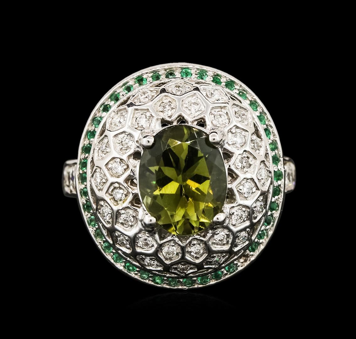 One electronically tested 14KT white gold ladies cast multi gemstone and diamond ring with a bright polish finish. The featured green tourmaline is set within tiered diamond bezels and an outer green chrysoberyl bezel supported by diamond set shoulders, completed by a two millimeter wide band. Condition is new, good workmanship. Containing: One prong set oval mixed cut natural green tourmaline, measuring 9.80 x 7.80 x 5.50mm, 6% bulge factor, approximate weight of 2.76ct., clarity is eye clean, type I, medium dark, very slightly grayish, slightly yellowish green color, (GIA slyG 6/3), cut is good. Transmitting light with no distortion, transparent. Refractive index testing results of 1.62 to 1.64. This is a conclusive result for tourmaline. Graded in the setting. Forty-two prong set round mixed cut natural green chrysoberyls, measuring 1.00 - 1.00 x 0.65 mm, approximate total weight of 0.52ct., clarity is slightly included, medium dark, moderately strong, bluish green color, (GIA bG 6/4), cut is good. Transmitting light with a minimum of distortion, transparent. Naturally occurring internal & external characteristics are present. Color grade is an average for the group. Graded in the setting. Six prong set round brilliant cut diamonds, measuring 2.50 - 2.40 x 1.47mm (depth est.) approximate total weight of 6 Stones = 0.35ct. Graded in the setting. Clarity: SI-2 to I-1. Color: G - I Thirty-Two prong set round brilliant cut diamonds, measuring 1.40 - 1.30 x 0.81mm (depth est.) approximate total weight of 32 Stones = 0.38ct. Graded in the setting. Clarity: SI-1 to SI-2. Color: G - I. Total Weight of Colored Stones 3.28ct. Total Weight of Diamonds 0.73ct. Total Weight of Ring 9.19 grams. AIG Appraised at $4,505.00.