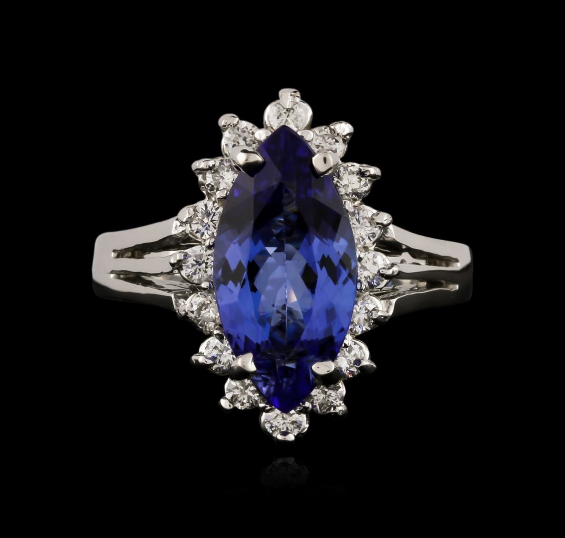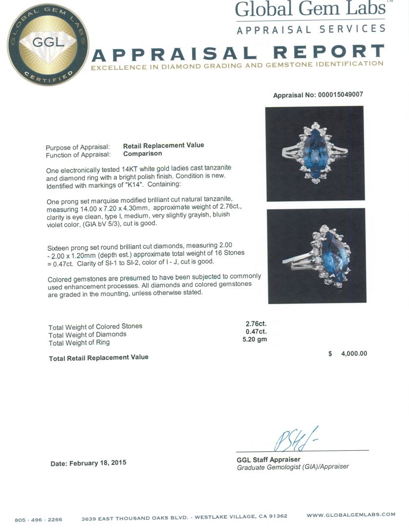 One electronically tested 14KT white gold ladies cast tanzanite and diamond ring with a bright polish finish. Identified with markings of "K14". Condition is new. Containing: One prong set marquise modified brilliant cut natural tanzanite, measuring 14.00 x 7.20 x 4.30mm, approximate weight of 2.76ct., clarity is eye clean, type I, medium, very slightly grayish, bluish violet color, (GIA bV 5/3), cut is good. Sixteen prong set round brilliant cut diamonds, measuring 2.00 - 2.00 x 1.20mm (depth est.) approximate total weight of 16 Stones = 0.47ct. Clarity: SI-1 to SI-2. Color: I - J, Cut is Good. Colored gemstones are presumed to have been subjected to commonly used enhancement processes. All diamonds and colored gemstones are graded in the mounting, unless otherwise stated. Total Weight of Colored Stones 2.76ct. Total Weight of Diamonds 0.47ct. Total Weight of Ring 5.20 grams. GGL Appraised at $4,000.00.