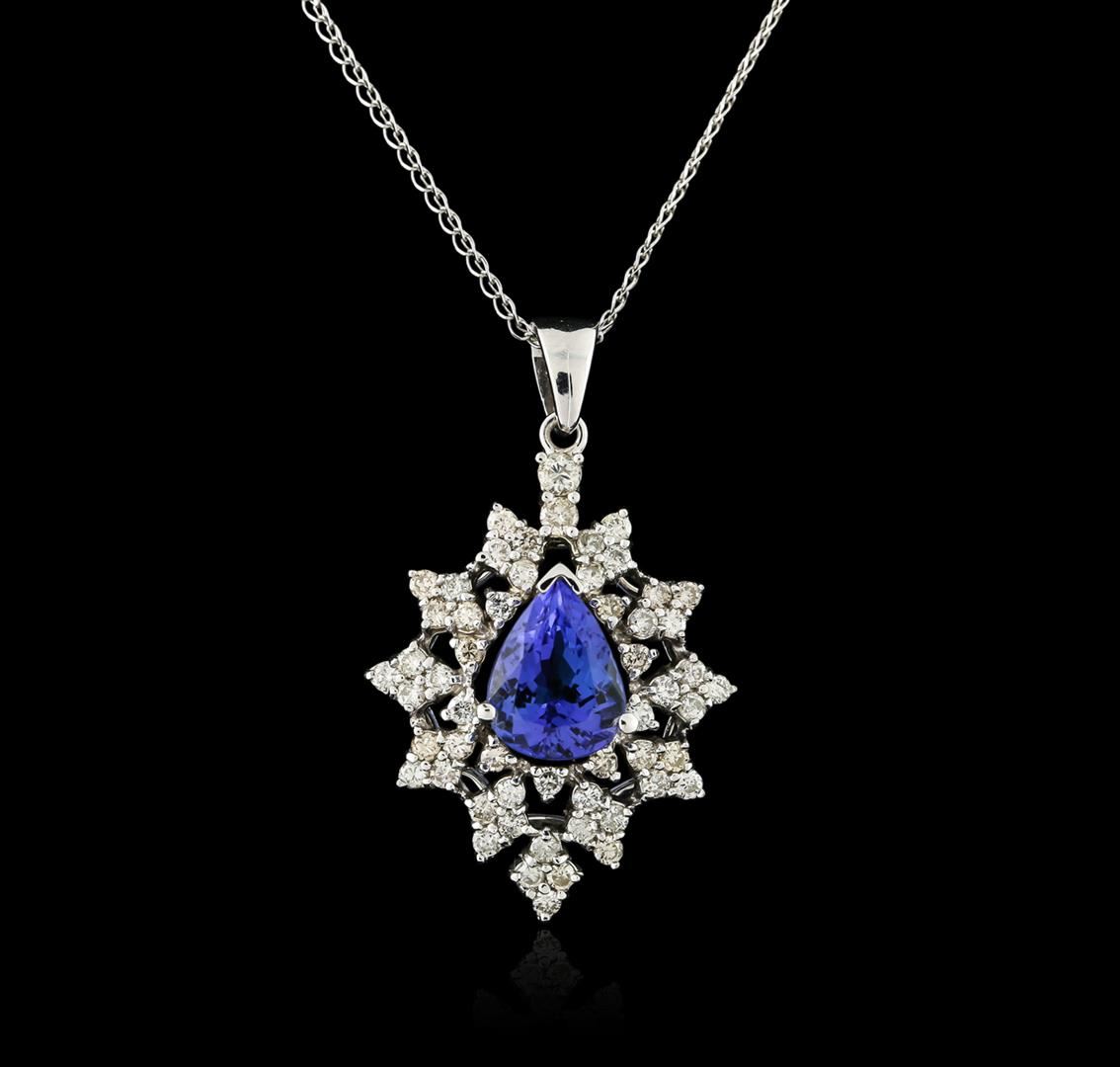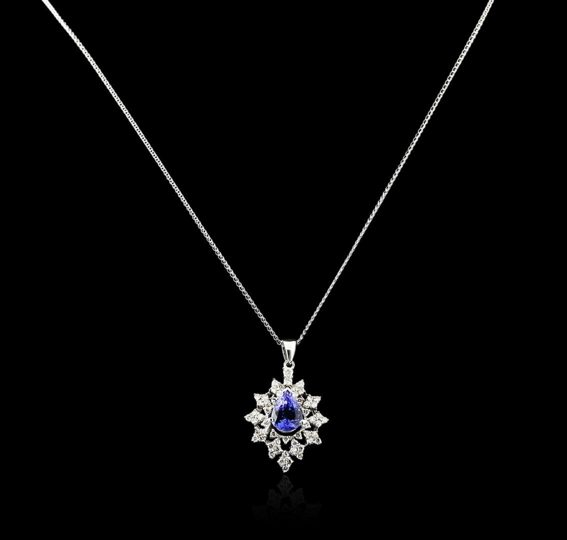 One electronically tested 14KT white gold ladies combination cast & assembled tanzanite and diamond pendant & chain 18.0" long, thin oval link with a spring ring clasp with a bright polish finish. Identified with markings of "14K". Condition is new. Containing: One prong set pear modified brilliant cut natural tanzanite, measuring 9.40 x 7.60 x 5.79mm, approximate weight of 2.77ct., clarity is eye clean, type I, medium light, very slightly grayish, bluish violet color, (GIA bV 4/3), cut is good. Fifty-Five prong set round brilliant cut diamonds, measuring 1.70 - 1.50 x 0.96mm (depth est.) approximate total weight of 55 Stones = 0.82ct. Clarity: SI-2 to I-2. Color: J - K, Cut is Good. Diamonds and colored gemstones are graded in the mounting, unless otherwise stated. Colored gemstones are presumed to have been subjected to commonly used enhancement processes. Total Weight of Colored Stones 2.77ct. Total Weight of Diamonds 0.82ct. Total Weight of Pendant & Chain 6.20 grams. GGL Appraised at $3,305.00.