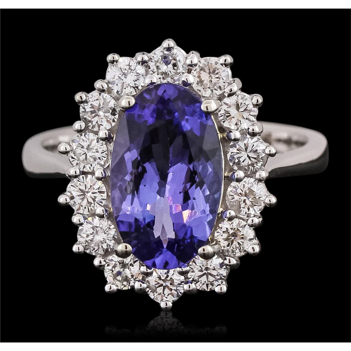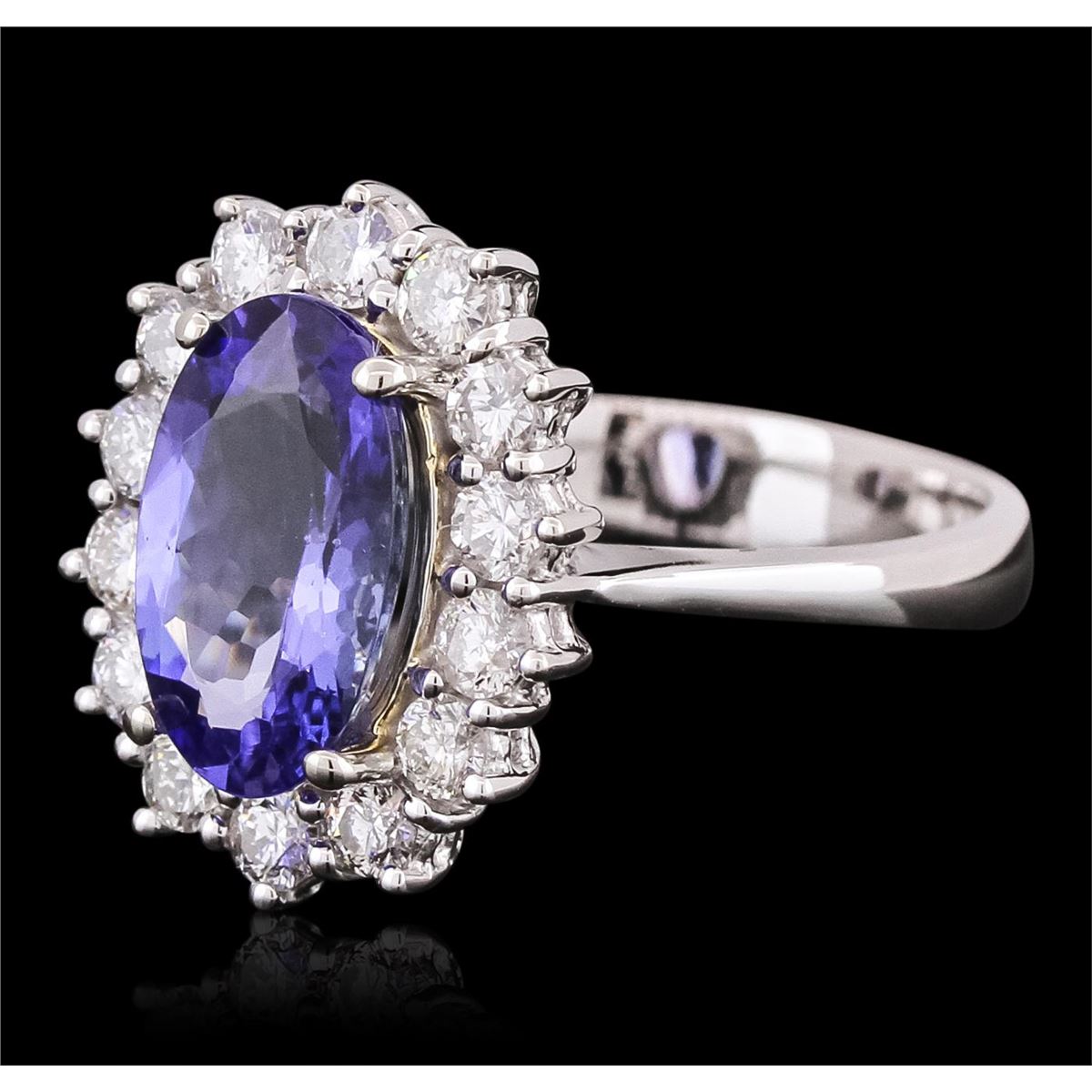 One electronically tested 14KT white gold ladies combination cast & assembled ring with a bright polish finish. Identified with markings of "14K". Condition is new. Containing: One prong set oval modified brilliant cut natural tanzanite, measuring 11.95 x 7.23 x 4.50mm, approximate weight of 2.77ct., clarity is eye clean, type I, medium light, very slightly grayish, violet color, (GIA V 4/3), cut is good. Fourteen prong set round brilliant cut diamonds, measuring 2.50 - 2.50 x 1.50mm (depth est.) approximate total weight of 14 Stones = 0.80ct. Clarity: SI-1. Color: I - J, Cut is Good. Colored gemstones are presumed to have been subjected to commonly used enhancement processes. All diamonds and colored gemstones are graded in the mounting, unless otherwise stated. Total Weight of Colored Stones 2.77ct. Total Weight of Diamonds 0.80ct. Total Weight of Ring 6.00 grams. GGL Appraised at $8,485.00.