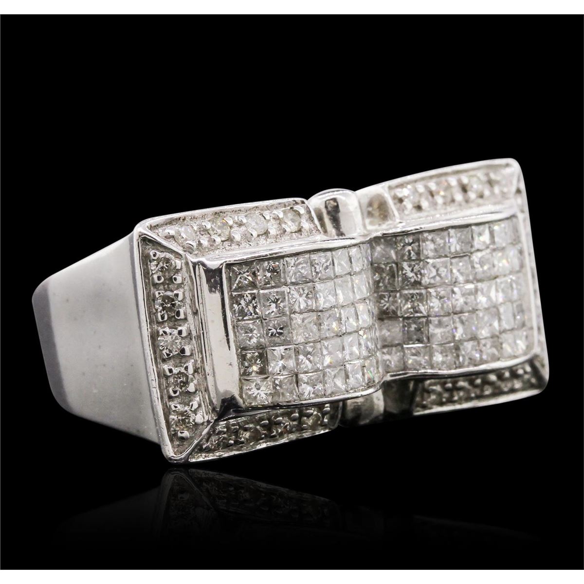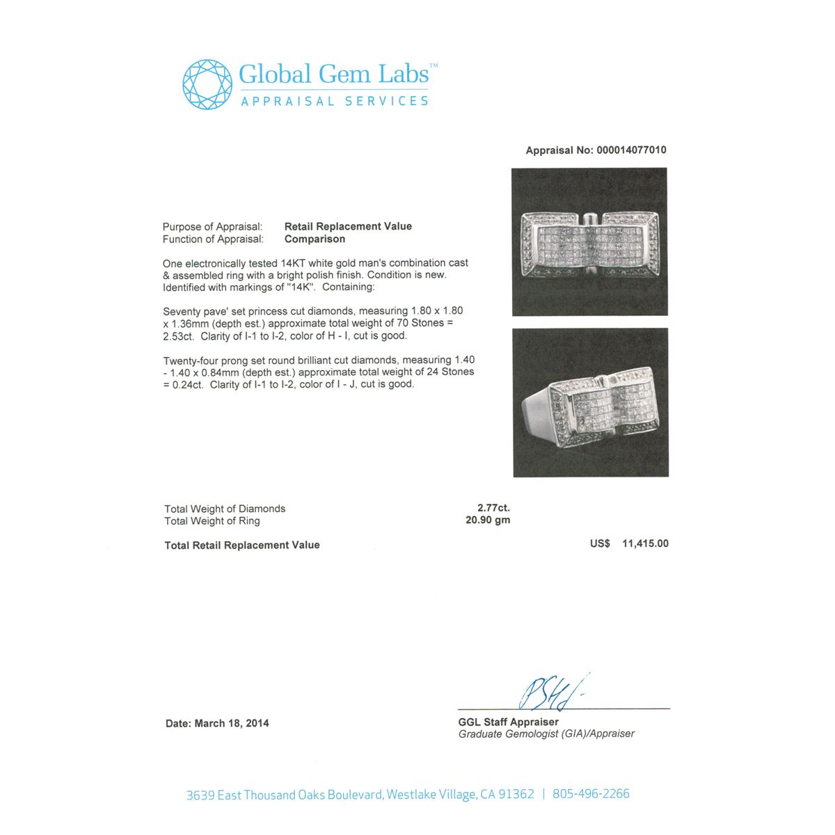 One electronically tested 14KT white gold man's combination cast & assembled ring with a bright polish finish. Condition is new. Identified with markings of "14K". Containing: Seventy pave' set princess cut diamonds, measuring 1.80 x 1.80 x 1.36mm (depth est.) approximate. Total Weight of 70 Stones = 2.53ct. Clarity: I-1 to I-2. Color: H - I, Cut is Good. Twenty-Four prong set round brilliant cut diamonds, measuring 1.40 - 1.40 x 0.84mm (depth est.) approximate. Total Weight of 24 Stones = 0.24ct. Clarity: I-1 to I-2. Color: I - J, Cut is Good. Total Weight of Diamonds 2.77ct. Total Weight of Ring 20.90gm. GGL Appraised at $11,415.00.