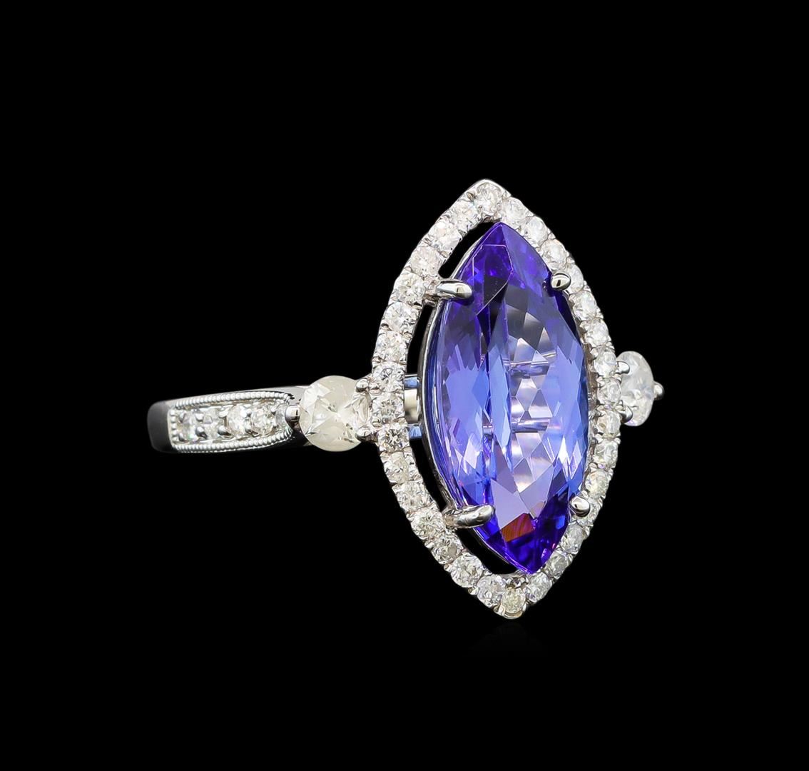 One electronically tested 14KT white gold ladies cast tanzanite and diamond ring with a bright polish finish. Identified with markings of "14K". Condition is new. Containing: One prong set marquise modified brilliant cut natural tanzanite, measuring 14.45 x 6.59 x 4.59mm, approximate weight of 2.78ct., clarity is eye clean, type I, medium, moderately strong, violet color, (GIA V 5/4), cut is good. Two prong set round brilliant cut diamonds, measuring 3.50 - 3.50 x 2.10mm (depth est.) approximate total weight of 2 Stones = 0.31ct. Clarity: I-1 to I-2. Color: I - J. Forty-Two prong set round brilliant cut diamonds, measuring 1.20 - 1.20 x 0.72mm (depth est.) approximate total weight of 42 Stones = 0.27ct. Clarity: SI-2 to I-1. Color: I - J, Cut is Good. Colored gemstones are presumed to have been subjected to commonly used enhancement processes. All diamonds and colored gemstones are graded in the mounting, unless otherwise stated. Total Weight of Colored Stones 2.78ct. Total Weight of Diamonds 0.58ct. Total Weight of Ring 3.10 grams. GGL Appraised at $3,755.00.