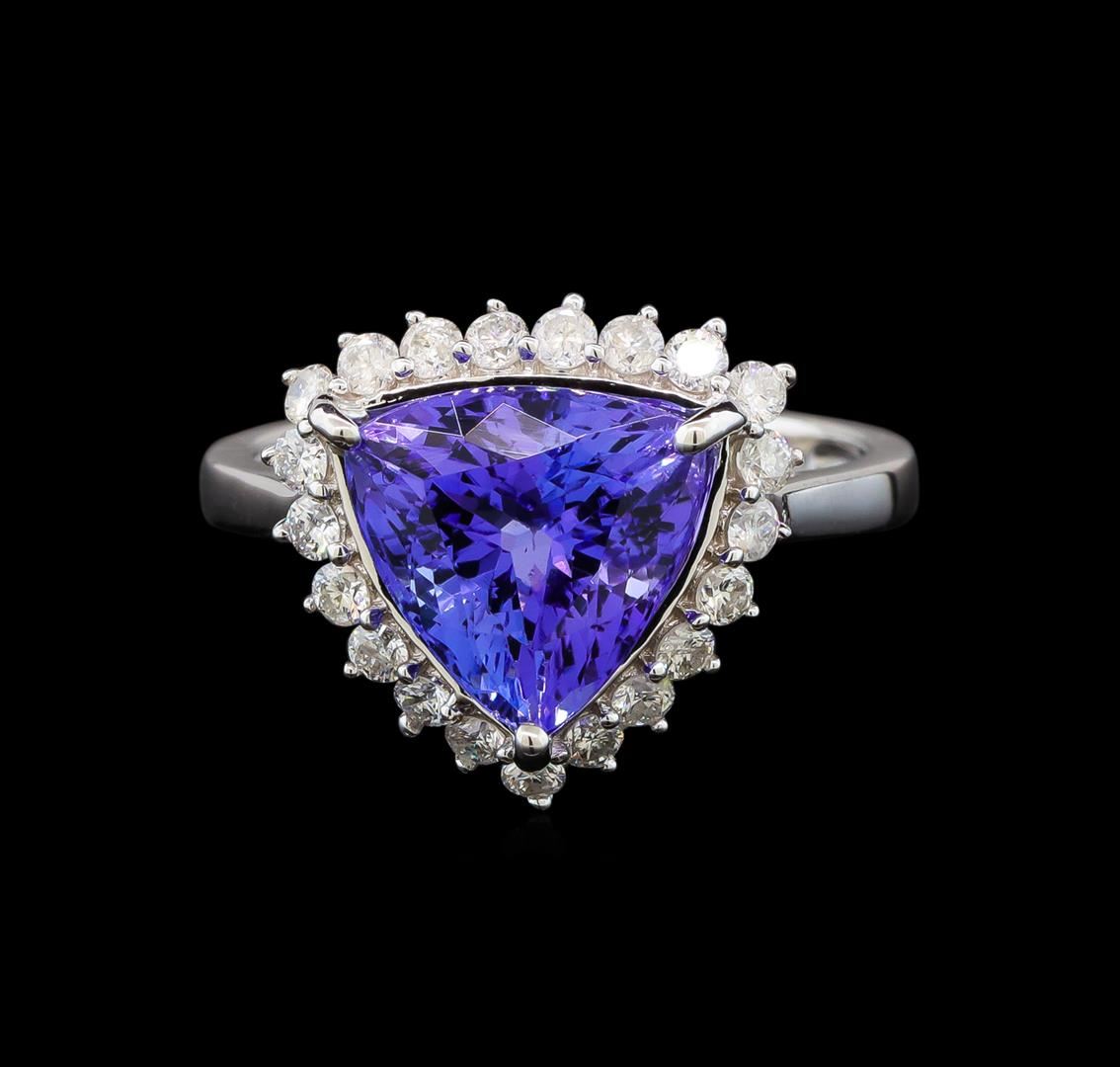 One electronically tested 14KT white gold ladies cast tanzanite and diamond ring with a cathedral shank with a bright polish finish. Trademark is Orianne. Identified with markings of "14K". Condition is new. Containing: One prong set triangle modified brilliant cut natural tanzanite, measuring 9.24 x 9.43 x 5.30mm, approximate weight of 2.78ct., clarity is eye clean, type I, medium light, moderately strong, violet color, (GIA V 4/4), cut is good. Twenty-One prong set round brilliant cut diamonds, measuring 1.30 - 1.30 x 0.78mm (depth est.) approximate total weight of 21 Stones = 0.17ct. Clarity: SI-2 to I-2. Color: I - J. All diamonds and colored gemstones are graded in the mounting, unless otherwise stated. Colored gemstones are presumed to have been subjected to commonly used enhancement processes. Total Weight of Colored Stones 2.78ct. Total Weight of Diamonds 0.17ct. Total Weight of Ring 3.40 grams. GGL Appraised at $3,120.00.