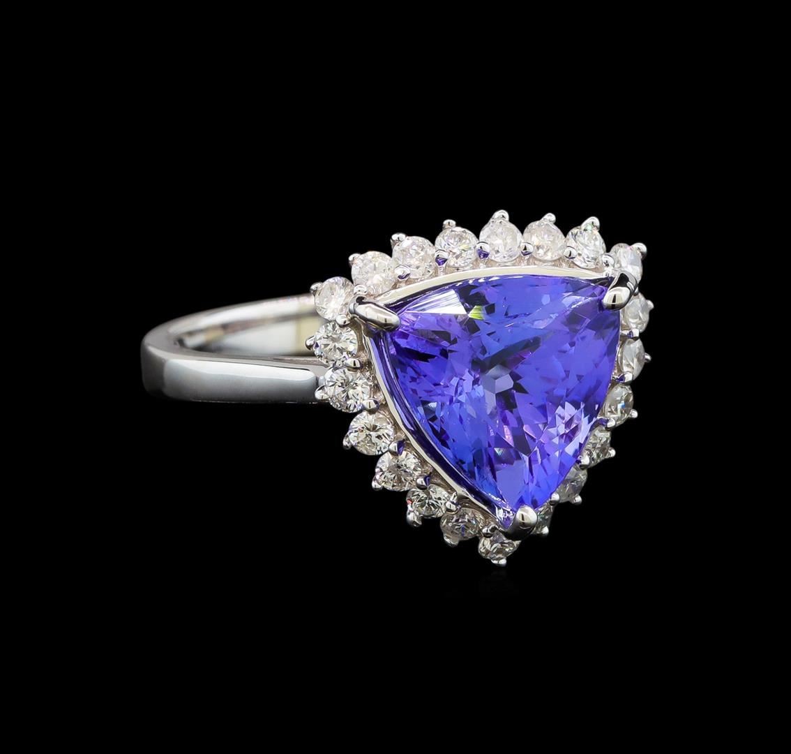 One electronically tested 14KT white gold ladies cast tanzanite and diamond ring with a cathedral shank with a bright polish finish. Trademark is Orianne. Identified with markings of "14K". Condition is new. Containing: One prong set triangle modified brilliant cut natural tanzanite, measuring 9.24 x 9.43 x 5.30mm, approximate weight of 2.78ct., clarity is eye clean, type I, medium light, moderately strong, violet color, (GIA V 4/4), cut is good. Twenty-One prong set round brilliant cut diamonds, measuring 1.30 - 1.30 x 0.78mm (depth est.) approximate total weight of 21 Stones = 0.17ct. Clarity: SI-2 to I-2. Color: I - J. All diamonds and colored gemstones are graded in the mounting, unless otherwise stated. Colored gemstones are presumed to have been subjected to commonly used enhancement processes. Total Weight of Colored Stones 2.78ct. Total Weight of Diamonds 0.17ct. Total Weight of Ring 3.40 grams. GGL Appraised at $3,120.00.