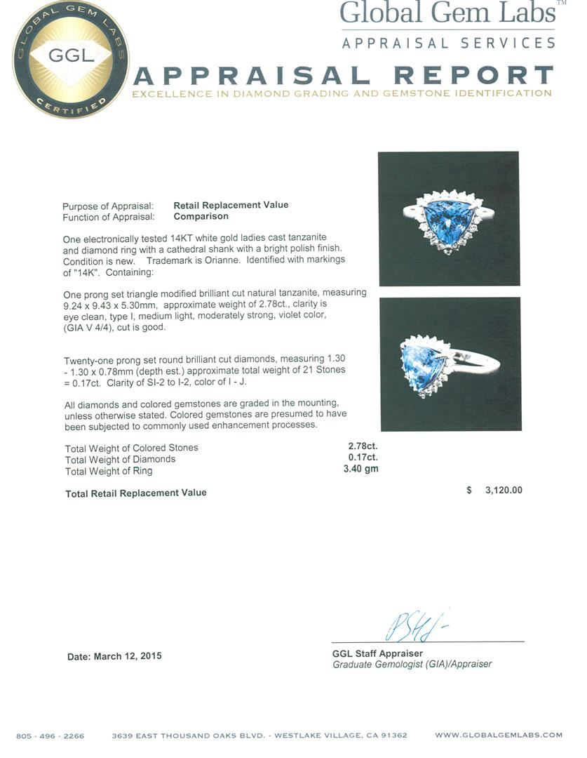 One electronically tested 14KT white gold ladies cast tanzanite and diamond ring with a cathedral shank with a bright polish finish. Trademark is Orianne. Identified with markings of "14K". Condition is new. Containing: One prong set triangle modified brilliant cut natural tanzanite, measuring 9.24 x 9.43 x 5.30mm, approximate weight of 2.78ct., clarity is eye clean, type I, medium light, moderately strong, violet color, (GIA V 4/4), cut is good. Twenty-One prong set round brilliant cut diamonds, measuring 1.30 - 1.30 x 0.78mm (depth est.) approximate total weight of 21 Stones = 0.17ct. Clarity: SI-2 to I-2. Color: I - J. All diamonds and colored gemstones are graded in the mounting, unless otherwise stated. Colored gemstones are presumed to have been subjected to commonly used enhancement processes. Total Weight of Colored Stones 2.78ct. Total Weight of Diamonds 0.17ct. Total Weight of Ring 3.40 grams. GGL Appraised.
