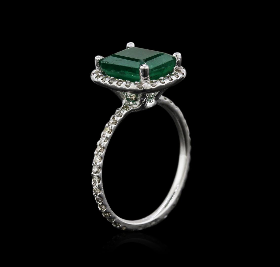 One electronically tested 14KT white gold ladies cast emerald and diamond ring with a bright polish finish. Identified with markings of "14K". Condition is new. Containing: One prong set emerald standard step cut natural emerald, measuring 9.00 x 7.85 x 5.36mm, approximate weight of 2.78ct., clarity is heavily included, type III, medium, moderately strong, green color, (GIA G 5/4), cut is good. Fifty-Six prong set round brilliant cut diamonds, measuring 1.30 - 1.30 x 0.78mm (depth est.) approximate total weight of 56 Stones = 0.45ct. Clarity: I-1 to I-2. Color: I - J, Cut is Good. All diamonds and colored gemstones are graded in the mounting, unless otherwise stated. Colored gemstones are presumed to have been subjected to commonly used enhancement processes. Total Weight of Colored Stones 2.78ct. Total Weight of Diamonds 0.45ct. Total Weight of Ring 2.96 grams. GGL Appraised at $2,015.00.