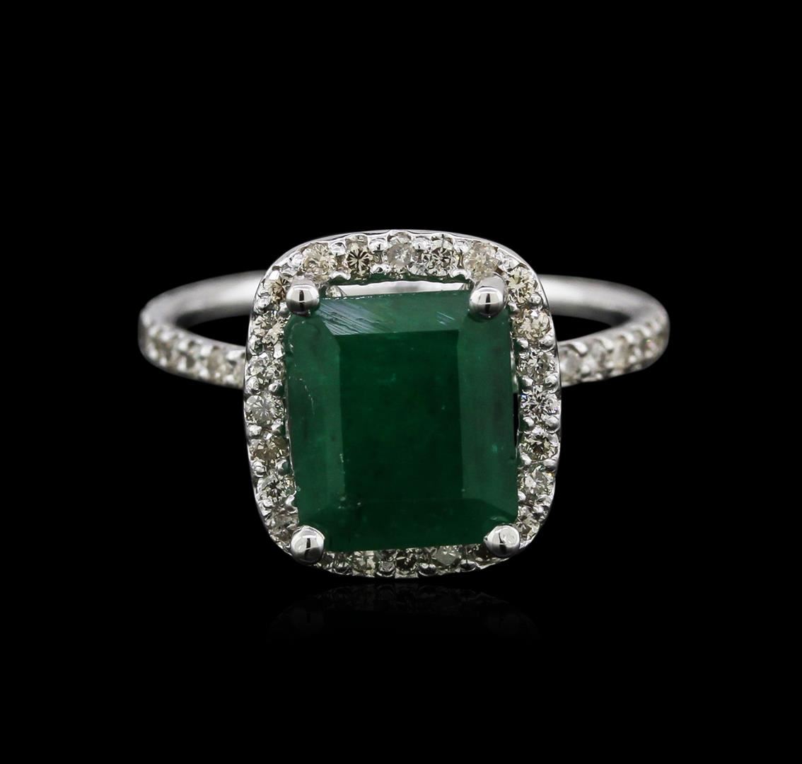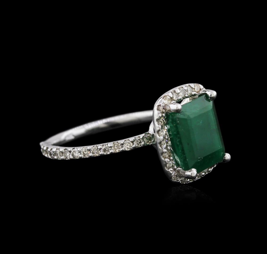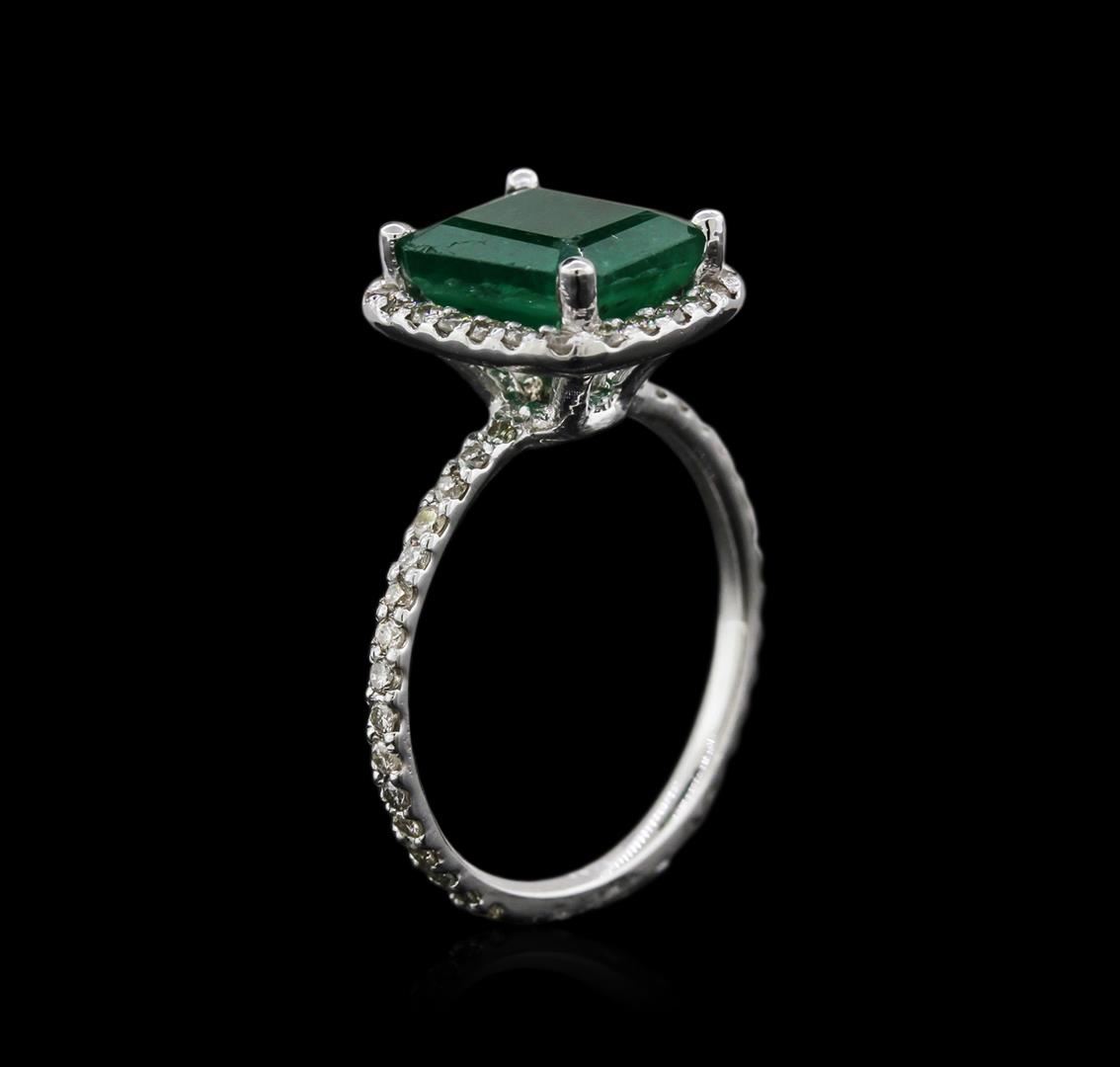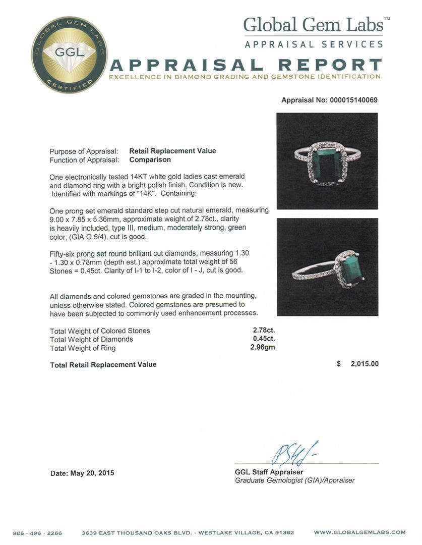 One electronically tested 14KT white gold ladies cast emerald and diamond ring with a bright polish finish. Identified with markings of "14K". Condition is new. Containing: One prong set emerald standard step cut natural emerald, measuring 9.00 x 7.85 x 5.36mm, approximate weight of 2.78ct., clarity is heavily included, type III, medium, moderately strong, green color, (GIA G 5/4), cut is good. Fifty-Six prong set round brilliant cut diamonds, measuring 1.30 - 1.30 x 0.78mm (depth est.) approximate total weight of 56 Stones = 0.45ct. Clarity: I-1 to I-2. Color: I - J, Cut is Good. All diamonds and colored gemstones are graded in the mounting, unless otherwise stated. Colored gemstones are presumed to have been subjected to commonly used enhancement processes. Total Weight of Colored Stones 2.78ct. Total Weight of Diamonds 0.45ct. Total Weight of Ring 2.96 grams. GGL Appraised at $2,015.00.