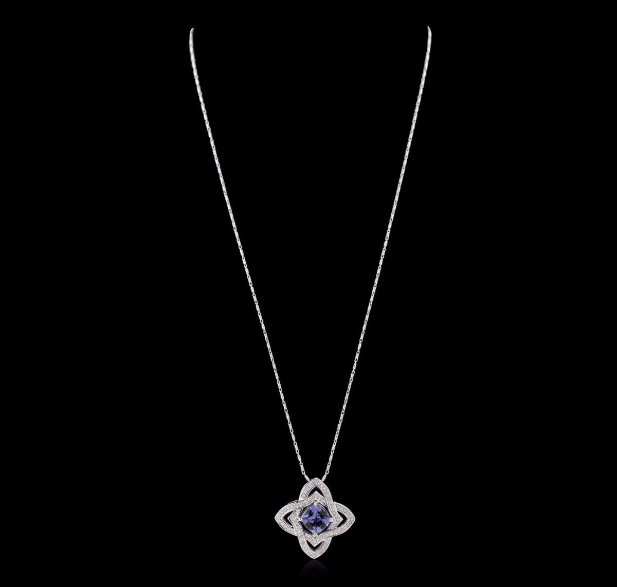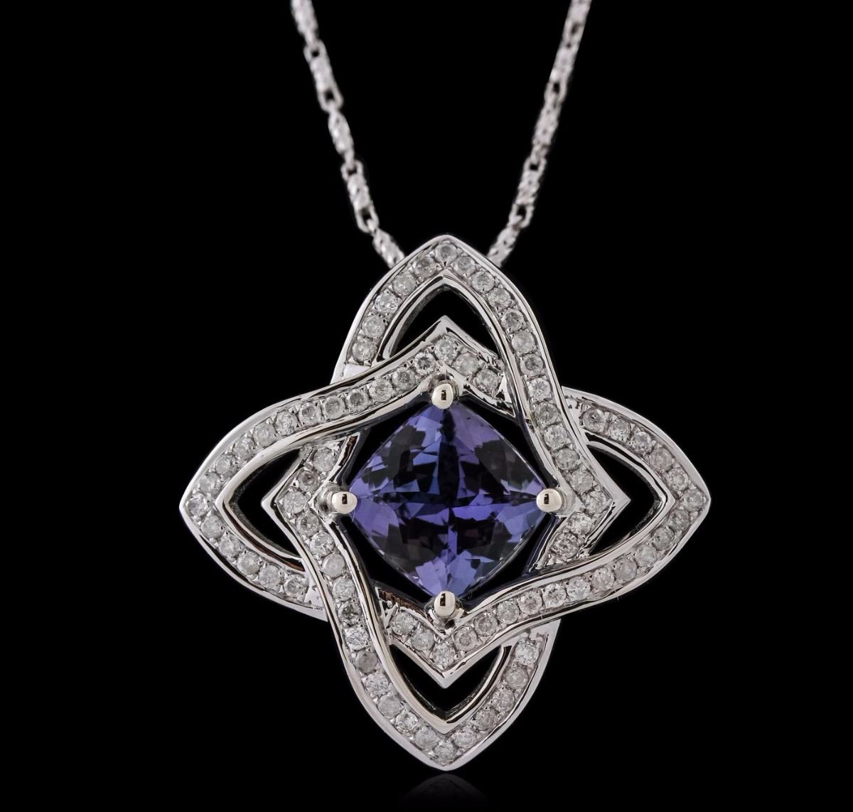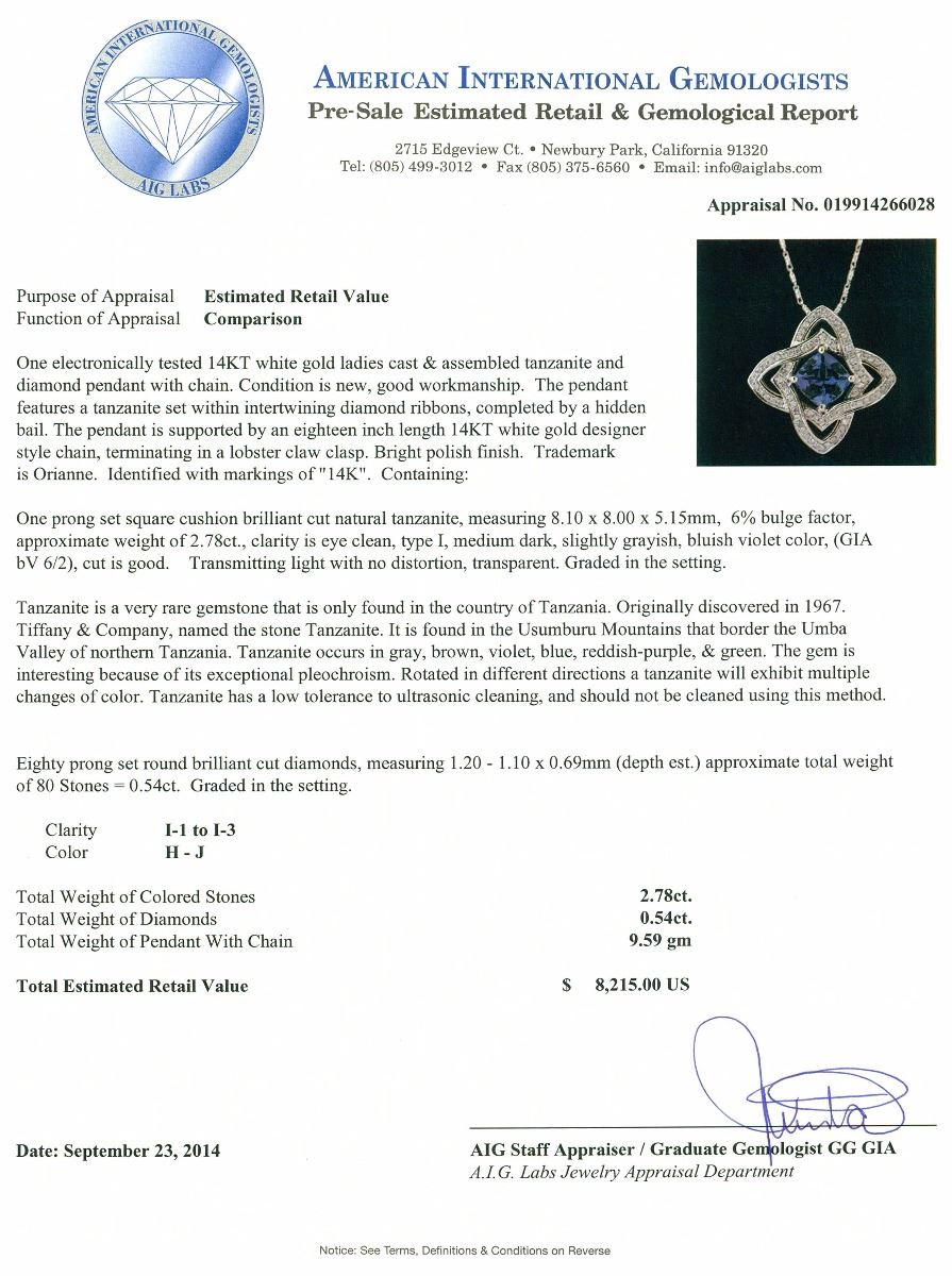 One electronically tested 14KT white gold ladies cast & assembled tanzanite and diamond pendant with chain. The pendant features a tanzanite set within intertwining diamond ribbons, completed by a hidden bail. The pendant is supported by an eighteen inch length 14KT white gold designer style chain, terminating in a lobster claw clasp. Bright polish finish. Trademark is Orianne. Identified with markings of "14K". Condition is new, good workmanship. Containing: One prong set square cushion brilliant cut natural tanzanite, measuring 8.10 x 8.00 x 5.15mm, 6% bulge factor, approximate weight of 2.78ct., clarity is eye clean, type I, medium dark, slightly grayish, bluish violet color, (GIA bV 6/2), cut is good. Transmitting light with no distortion, transparent. Graded in the setting. Tanzanite is a very rare gemstone that is only found in the country of Tanzania. Originally discovered in 1967. Tiffany & Company, named the stone Tanzanite. It is found in the Usumburu Mountains that border the Umba Valley of northern Tanzania. Tanzanite occurs in gray, brown, violet, blue, reddish-purple, & green. The gem is interesting because of its exceptional pleochroism. Rotated in different directions a tanzanite will exhibit multiple changes of color. Tanzanite has a low tolerance to ultrasonic cleaning, and should not be cleaned using this method. Eighty prong set round brilliant cut diamonds, measuring 1.20 - 1.10 x 0.69mm (depth est.) approximate total weight of 80 Stones = 0.54ct. Graded in the setting. Clarity: I-1 to I-3. Color: H - J. Total Weight of Colored Stones 2.78ct. Total Weight of Diamonds 0.54ct. Total Weight of Pendant With Chain 9.59 grams. AIG Appraised at $8,215.00.