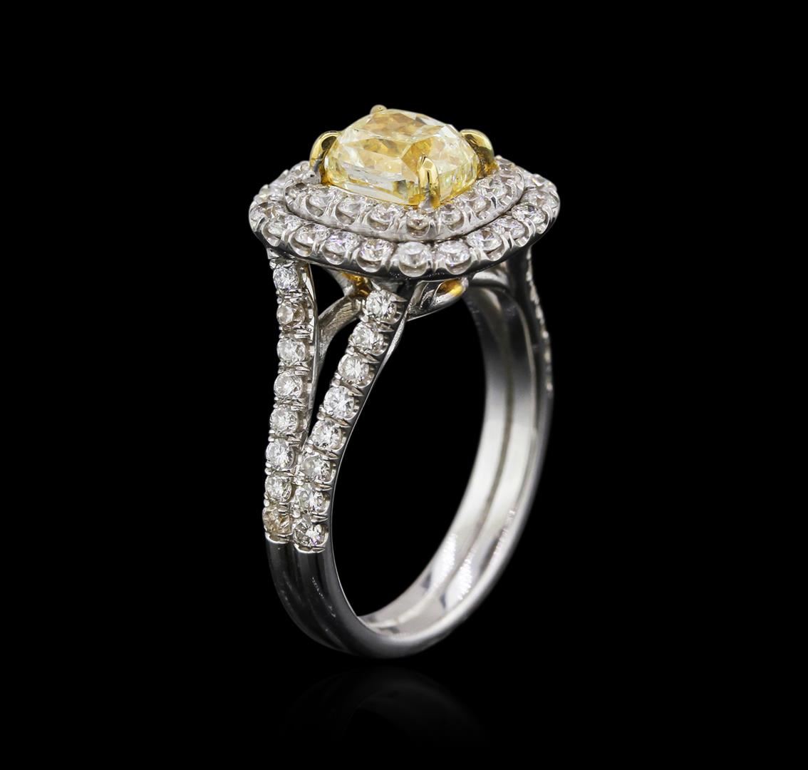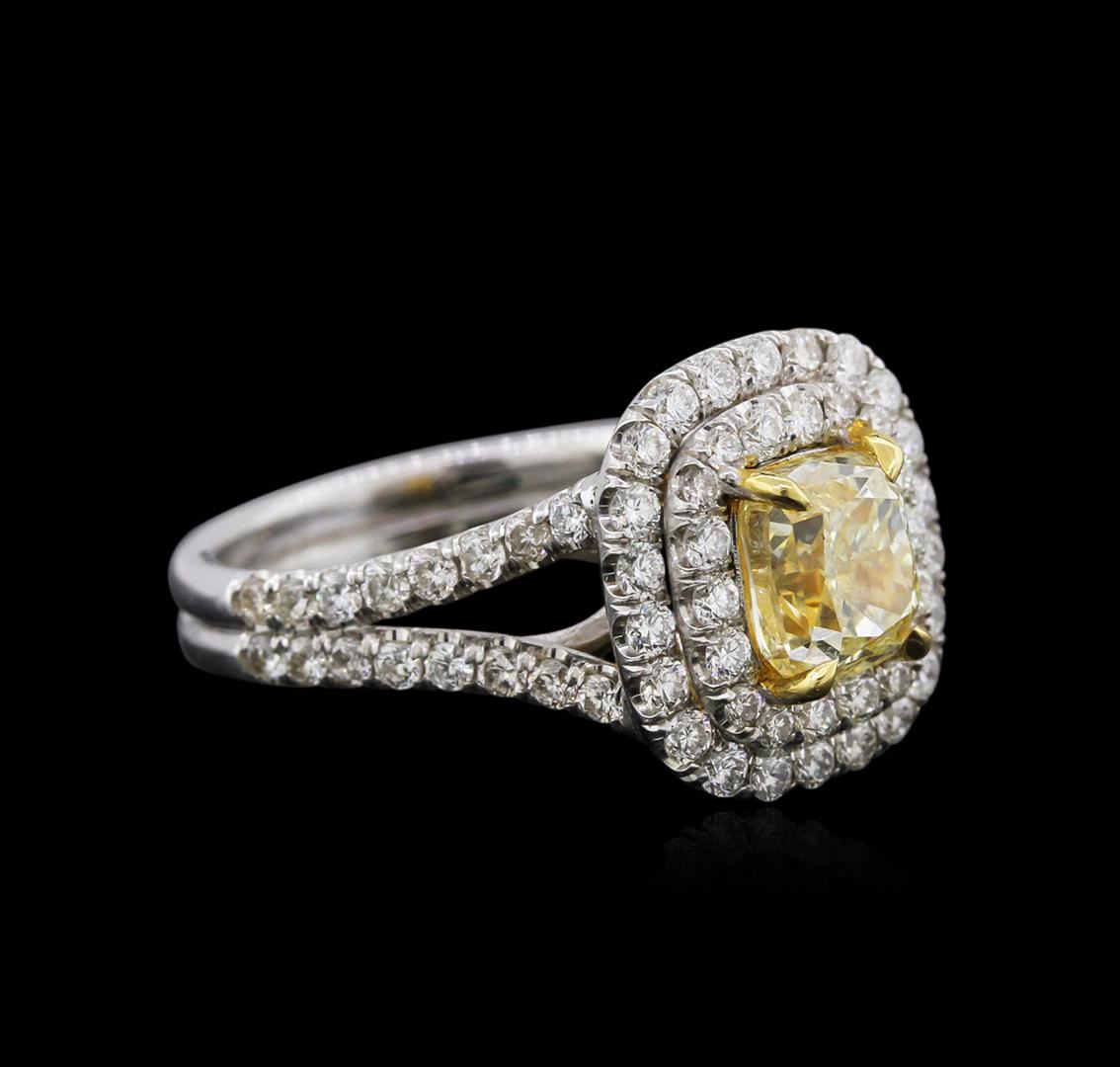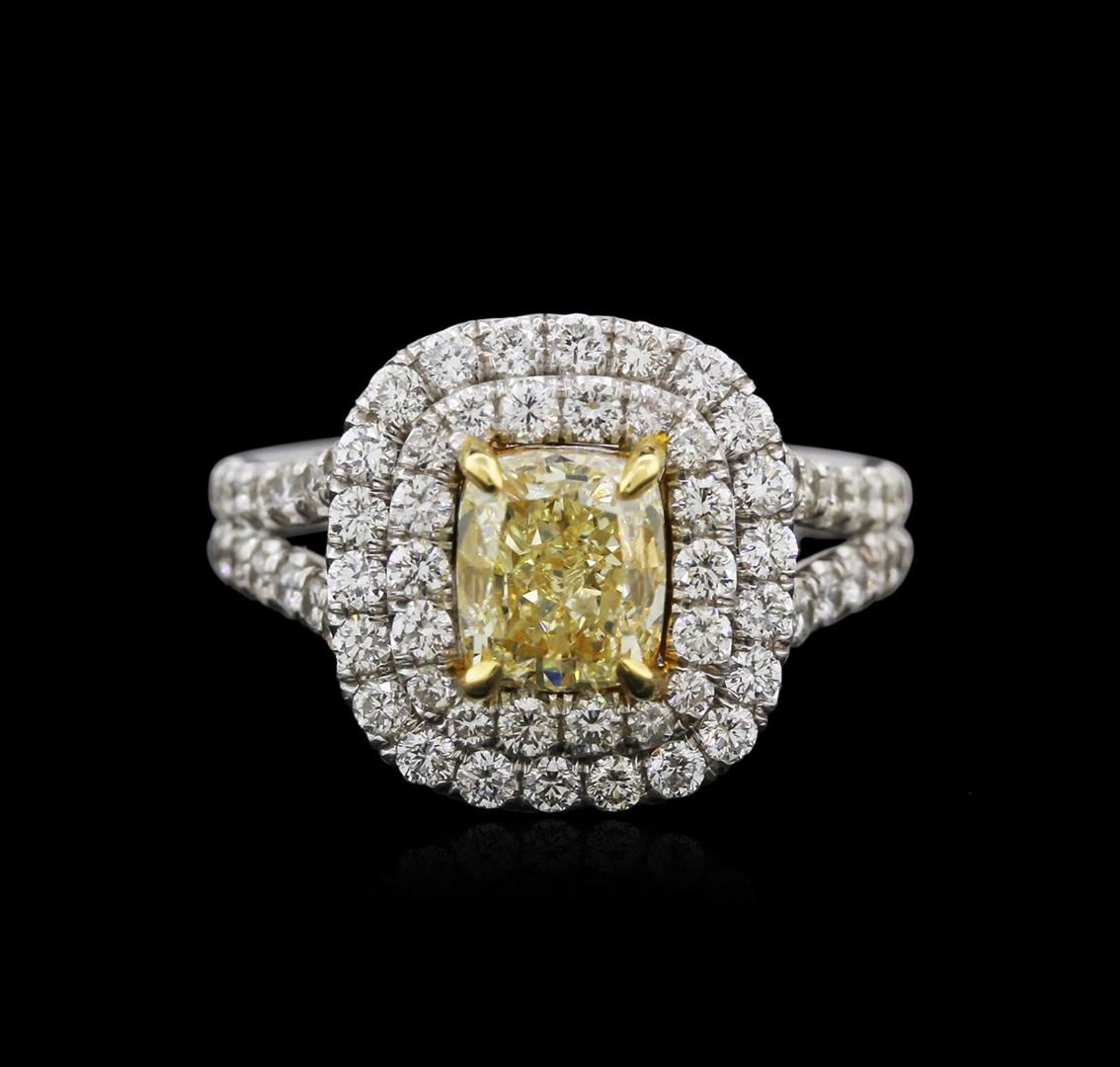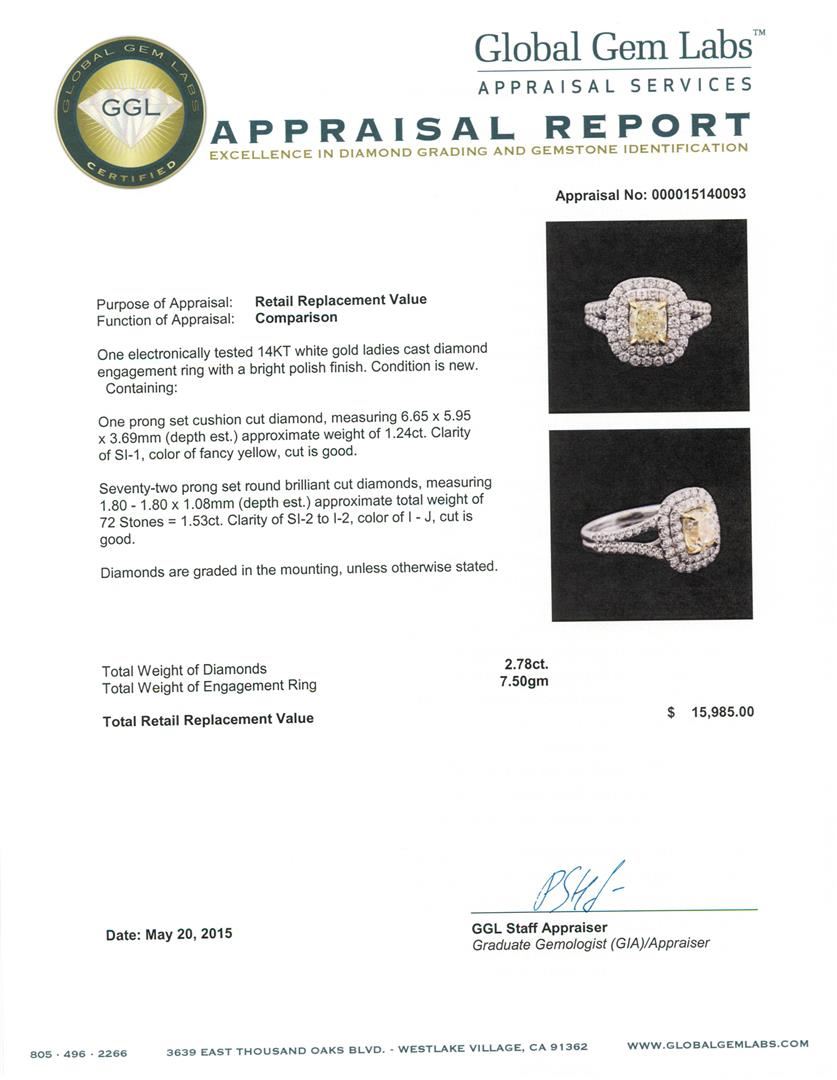 One electronically tested 14KT white gold ladies cast diamond engagement ring with a bright polish finish. Condition is new. Containing: One prong set cushion cut diamond, measuring 6.65 x 5.95 x 3.69mm (depth est.) approximate weight of 1.24ct. Clarity: SI-1, Cut is Good. Seventy-Two prong set round brilliant cut diamonds, measuring 1.80 - 1.80 x 1.08mm (depth est.) approximate total weight of 72 Stones = 1.53ct. Clarity: SI-2 to I-2. Color: I - J, Cut is Good. Diamonds are graded in the mounting, unless otherwise stated. Total Weight of Diamonds 2.78ct. Total Weight of Engagement Ring 7.50 grams. GGL Appraised at $15,985.00.