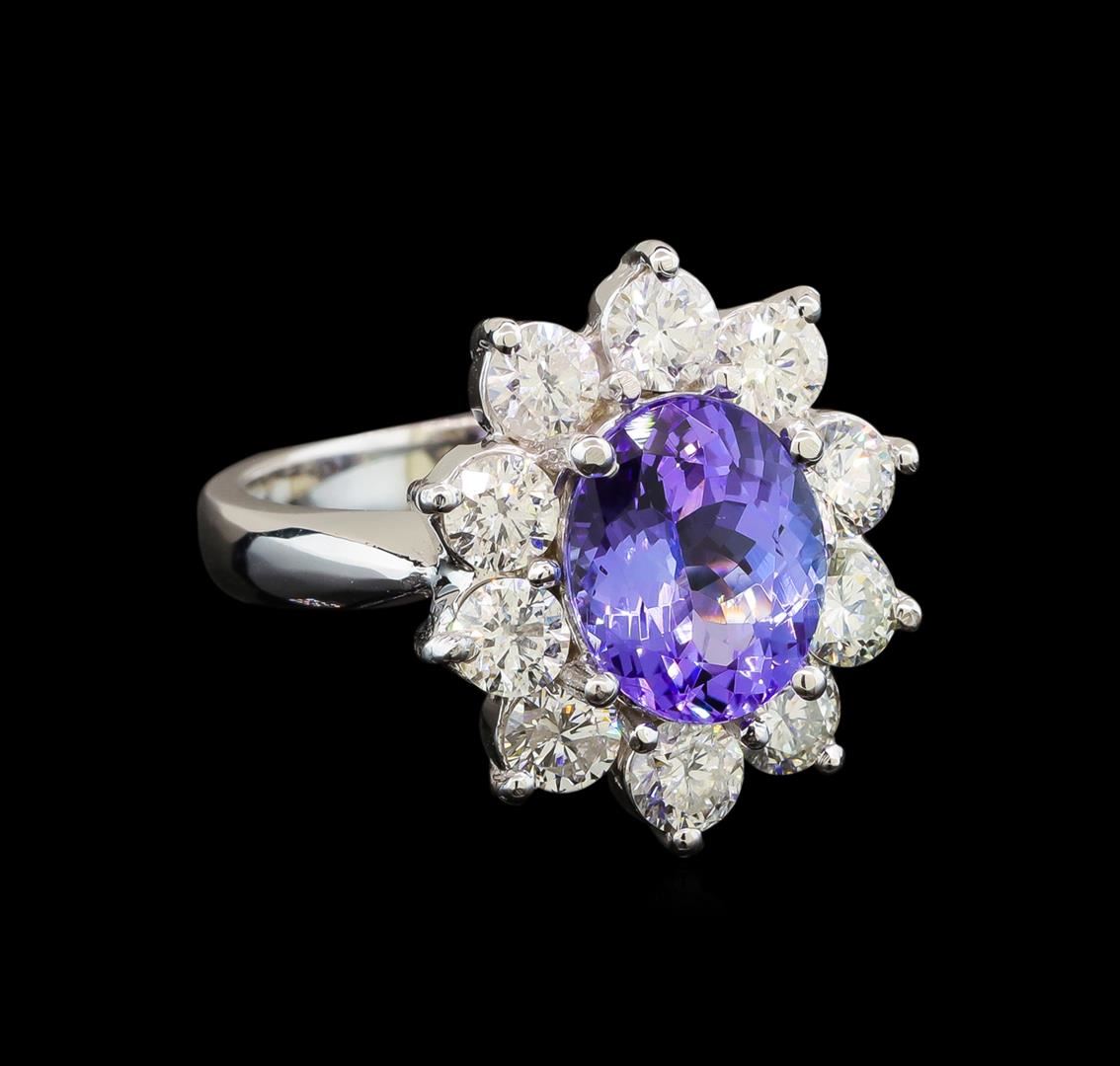 One electronically tested 14KT white gold ladies cast tanzanite and diamond ring with a bright polish finish. Identified with markings of "K14". Condition is new. Containing: One prong set oval modified brilliant cut natural tanzanite, measuring 10.00 x 7.90 x 5.04mm, approximate weight of 2.80ct., clarity is eye clean, type I, medium light, very slightly grayish, violet color, (GIA V 4/3), cut is good. Ten prong set round brilliant cut diamonds, measuring 3.50 - 3.50 x 2.10mm (depth est.) approximate total weight of 10 Stones = 1.57ct. Clarity: SI-2 to I-2. Color: H - I, Cut is Good. Colored gemstones are presumed to have been subjected to commonly used enhancement processes. All diamonds and colored gemstones are graded in the mounting, unless otherwise stated. Total Weight of Colored Stones 2.80ct. Total Weight of Diamonds 1.57ct. Total Weight of Ring 7.60 grams. GGL Appraised at $6,465.00.