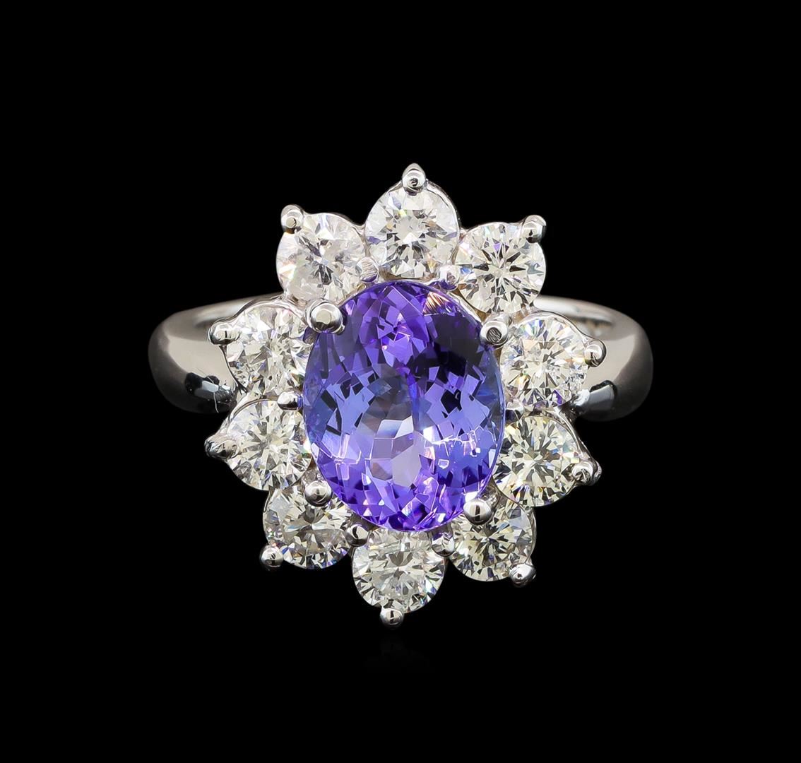 One electronically tested 14KT white gold ladies cast tanzanite and diamond ring with a bright polish finish. Identified with markings of "K14". Condition is new. Containing: One prong set oval modified brilliant cut natural tanzanite, measuring 10.00 x 7.90 x 5.04mm, approximate weight of 2.80 ct., clarity is eye clean, type I, medium light, very slightly grayish, violet color, (GIA V 4/3), cut is good. Ten prong set round brilliant cut diamonds, measuring 3.50 - 3.50 x 2.10mm (depth est.) approximate total weight of 10 Stones = 1.57ct. Clarity: SI-2 to I-2. Color: H - I, Cut is Good. Colored gemstones are presumed to have been subjected to commonly used enhancement processes. All diamonds and colored gemstones are graded in the mounting, unless otherwise stated. Total Weight of Colored Stones 2.80 ct. Total Weight of Diamonds 1.57ct. Total Weight of Ring 7.60 grams. GGL Appraised.