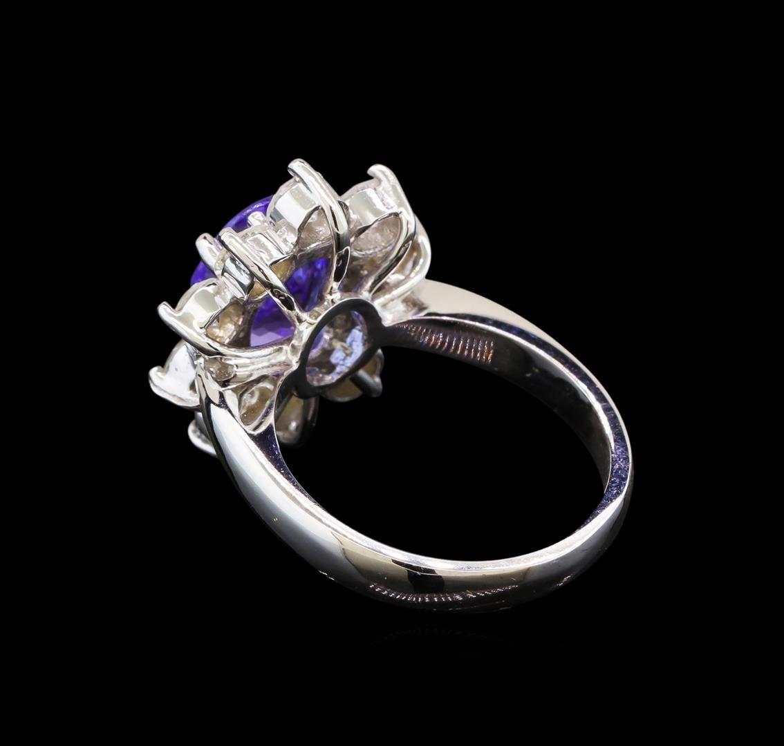 One electronically tested 14KT white gold ladies cast tanzanite and diamond ring with a bright polish finish. Identified with markings of "K14". Condition is new. Containing: One prong set oval modified brilliant cut natural tanzanite, measuring 10.00 x 7.90 x 5.04mm, approximate weight of 2.80 ct., clarity is eye clean, type I, medium light, very slightly grayish, violet color, (GIA V 4/3), cut is good. Ten prong set round brilliant cut diamonds, measuring 3.50 - 3.50 x 2.10mm (depth est.) approximate total weight of 10 Stones = 1.57ct. Clarity: SI-2 to I-2. Color: H - I, Cut is Good. Colored gemstones are presumed to have been subjected to commonly used enhancement processes. All diamonds and colored gemstones are graded in the mounting, unless otherwise stated. Total Weight of Colored Stones 2.80 ct. Total Weight of Diamonds 1.57ct. Total Weight of Ring 7.60 grams. GGL Appraised.
