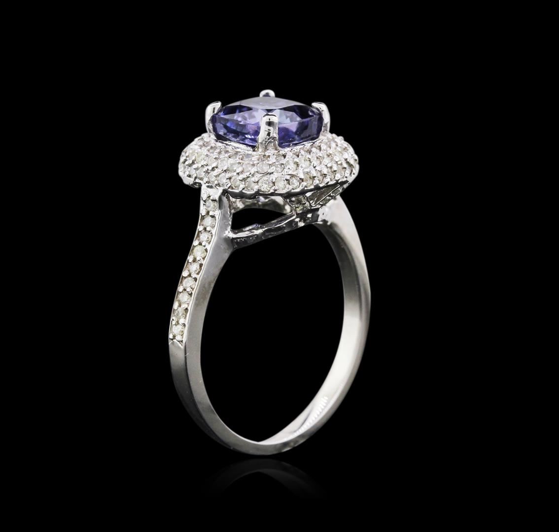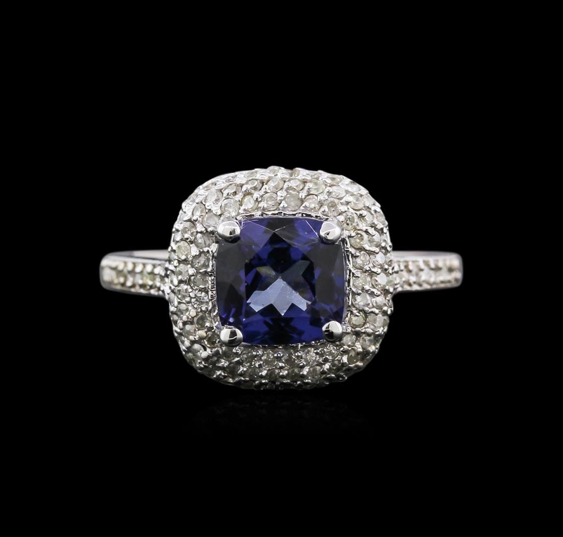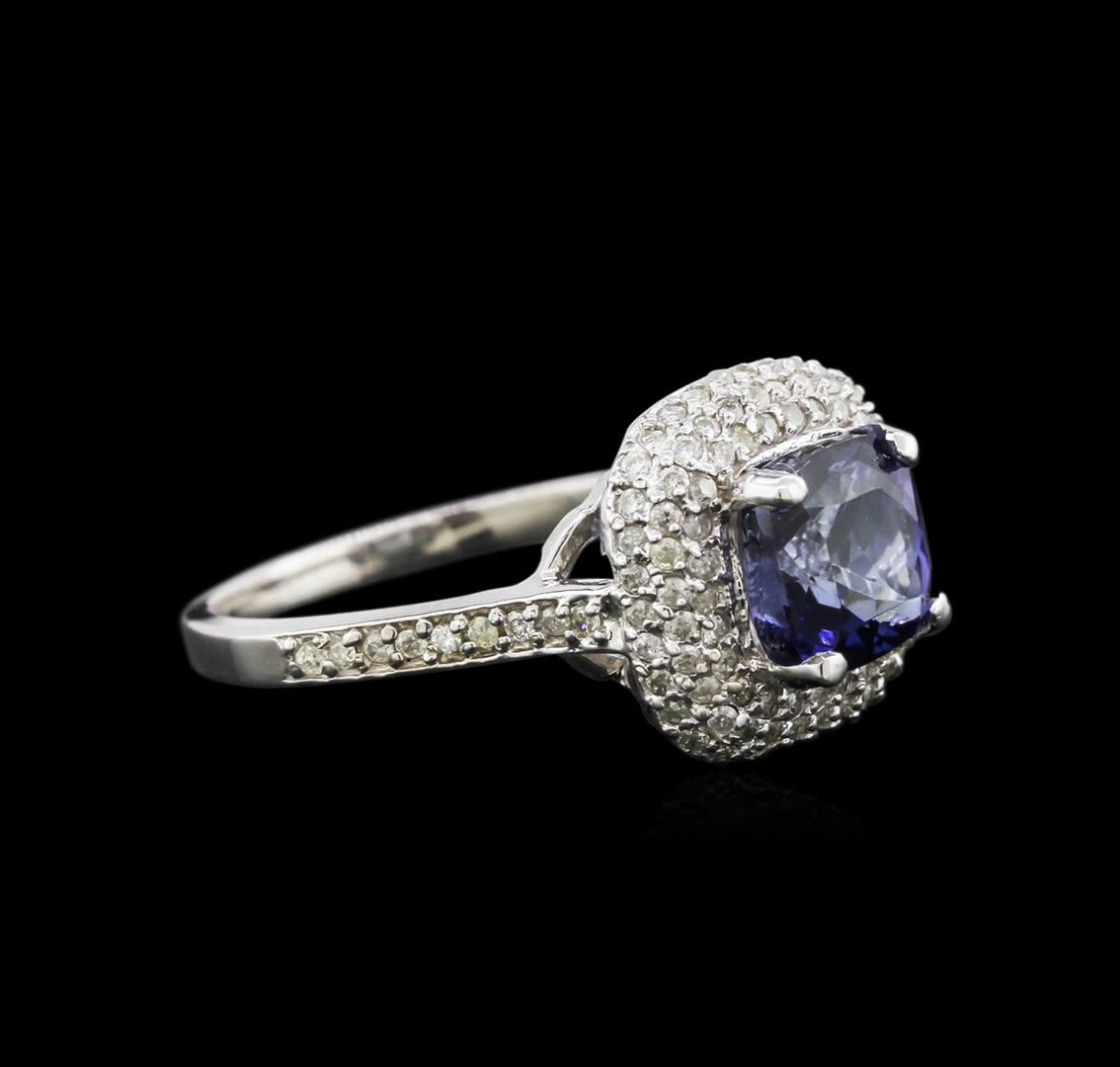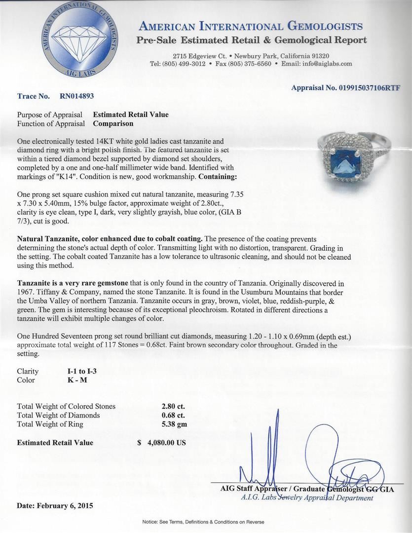 One electronically tested 14KT white gold ladies cast tanzanite and diamond ring with a bright polish finish. The featured tanzanite is set within a tiered diamond bezel supported by diamond set shoulders, completed by a one and one-half millimeter wide band. Trademark is Orianne. Identified with markings of "K14". Condition is new, good workmanship. Containing: One prong set square cushion mixed cut natural tanzanite, measuring 7.35 x 7.30 x 5.40mm, 15% bulge factor, approximate weight of 2.80ct., clarity is eye clean, type I, dark, very slightly grayish, blue color, (GIA B 7/3), cut is good. Natural Tanzanite, color enhanced due to cobalt coating. The presence of the coating prevents determining the stone's actual depth of color. Transmitting light with no distortion, transparent. Grading in the setting. The cobalt coated Tanzanite has a low tolerance to ultrasonic cleaning, and should not be cleaned using this method. Tanzanite is a very rare gemstone that is only found in the country of Tanzania. Originally discovered in 1967. Tiffany & Company, named the stone Tanzanite. It is found in the Usumburu Mountains that border the Umba Valley of northern Tanzania. Tanzanite occurs in gray, brown, violet, blue, reddish-purple, & green. The gem is interesting because of its exceptional pleochroism. Rotated in different directions a tanzanite will exhibit multiple changes of color. One Hundred Seventeen prong set round brilliant cut diamonds, measuring 1.20 - 1.10 x 0.69mm (depth est.) approximate total weight of 117 Stones = 0.68ct. Faint brown secondary color throughout. Graded in the setting. Clarity: I-1 to I-3. Color: K - M. Total Weight of Colored Stones: 2.80 ct. Total Weight of Diamonds: 0.68 ct. Total Weight of Ring: 5.38 gm. AIG Appraised at $4,080.00.